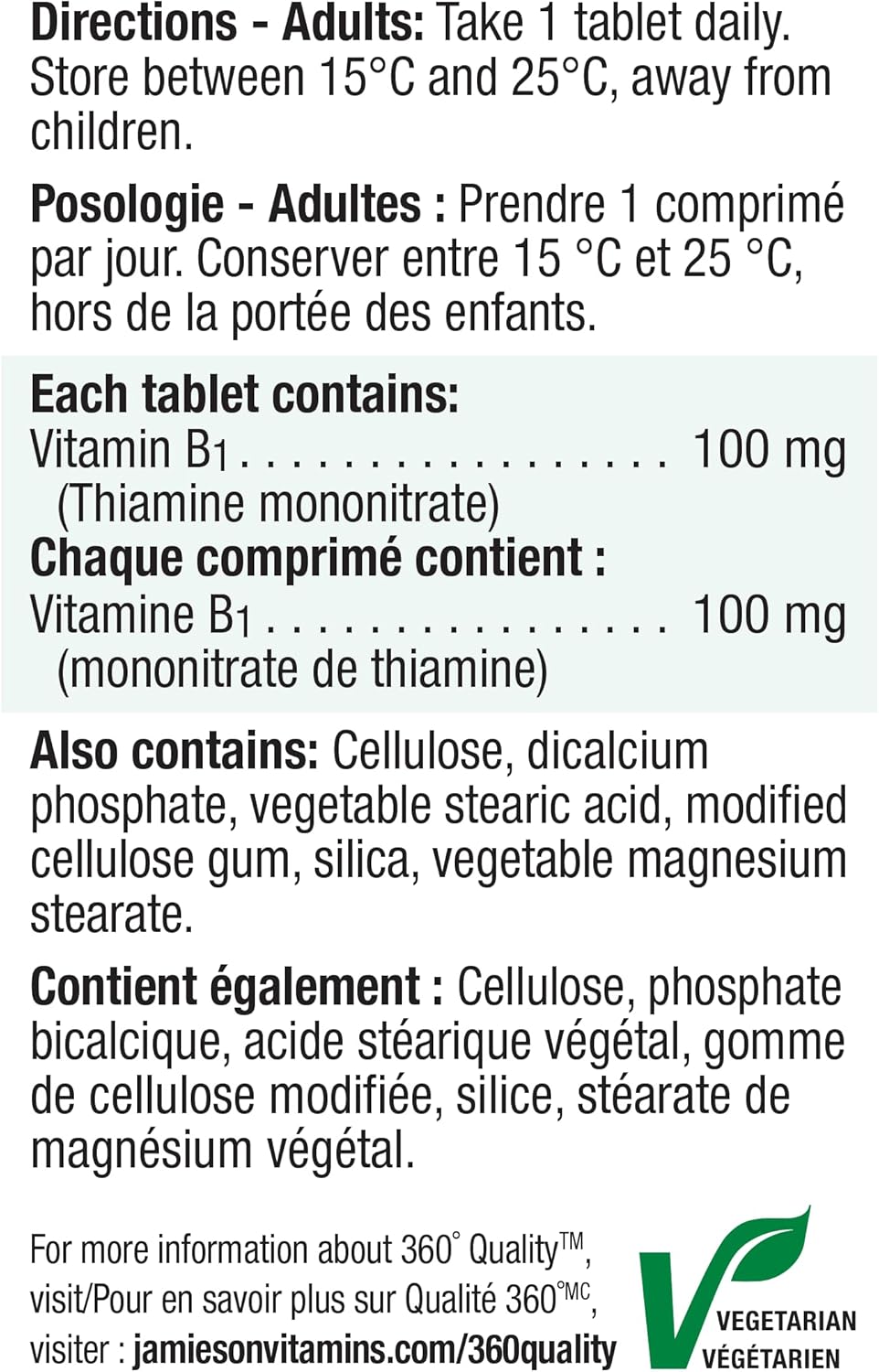 Jamieson 维生素 B1 每片含 100 毫克维生素 B1(硫胺素)。这种 B 族维生素有助于促进氨基酸和碳水化合物的代谢,同时促进神经系统健康。