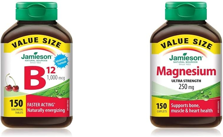 Jamieson 维生素 B12 甲钴胺 1,000 mcg 速溶片 - 超值装Jamieson 维生素 B12 1,000 mcg 速溶舌下片是 B12 的高效来源,有助于支持红细胞的生成以及碳水化合物、脂肪和蛋白质的代谢,提供自然的能量补充效果。Jamieson 镁 250 mg 超强效 - 超值装Jamieson 镁 250 mg 是一种高效、高吸收性的三种镁源天然复合物,有助于骨骼的发育和维持,并支持肌肉功能。