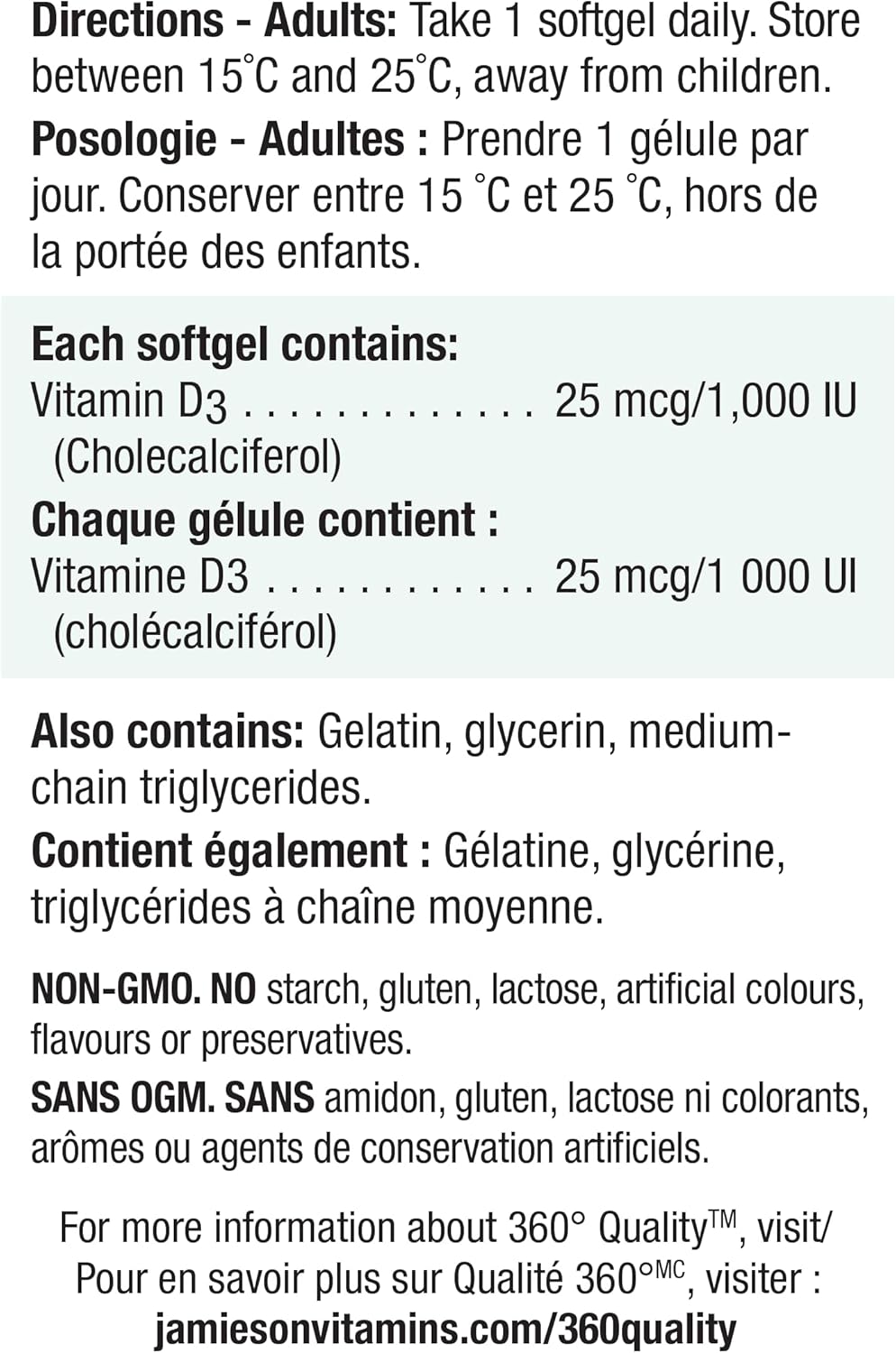 Jamieson 维生素 D3 1,000 IU 软胶囊,易于吞咽,支持免疫健康,强健骨骼和牙齿,增强钙和磷的吸收。非转基因,无麸质,每日一粒,500 粒,加拿大制造