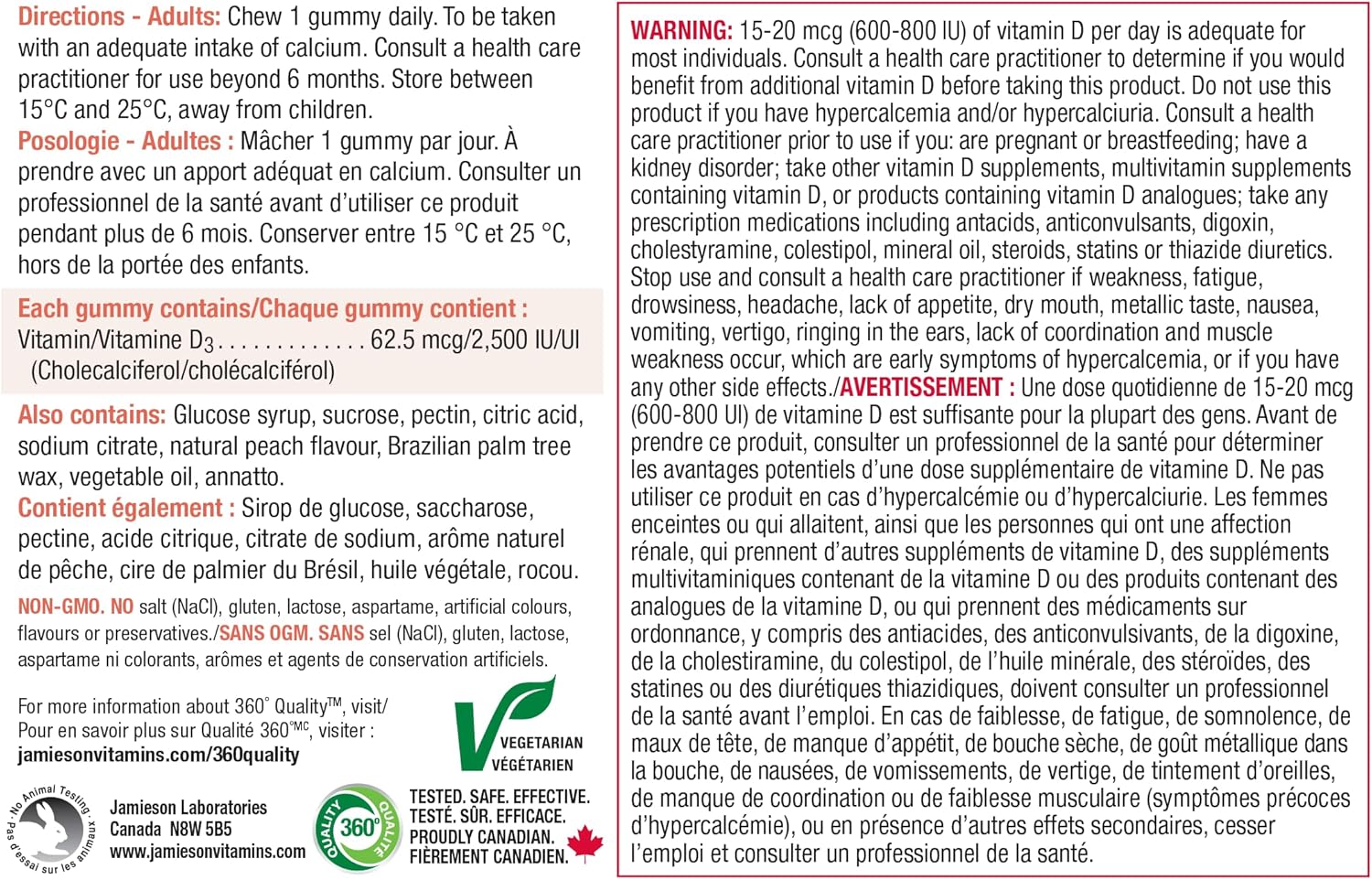 Jamieson 维生素 D3 2,500 IU 软糖,水蜜桃口味,有助于预防维生素 D 缺乏症和骨质疏松症,增强免疫力,强健骨骼和牙齿。素食,不含人工香料、色素或防腐剂……