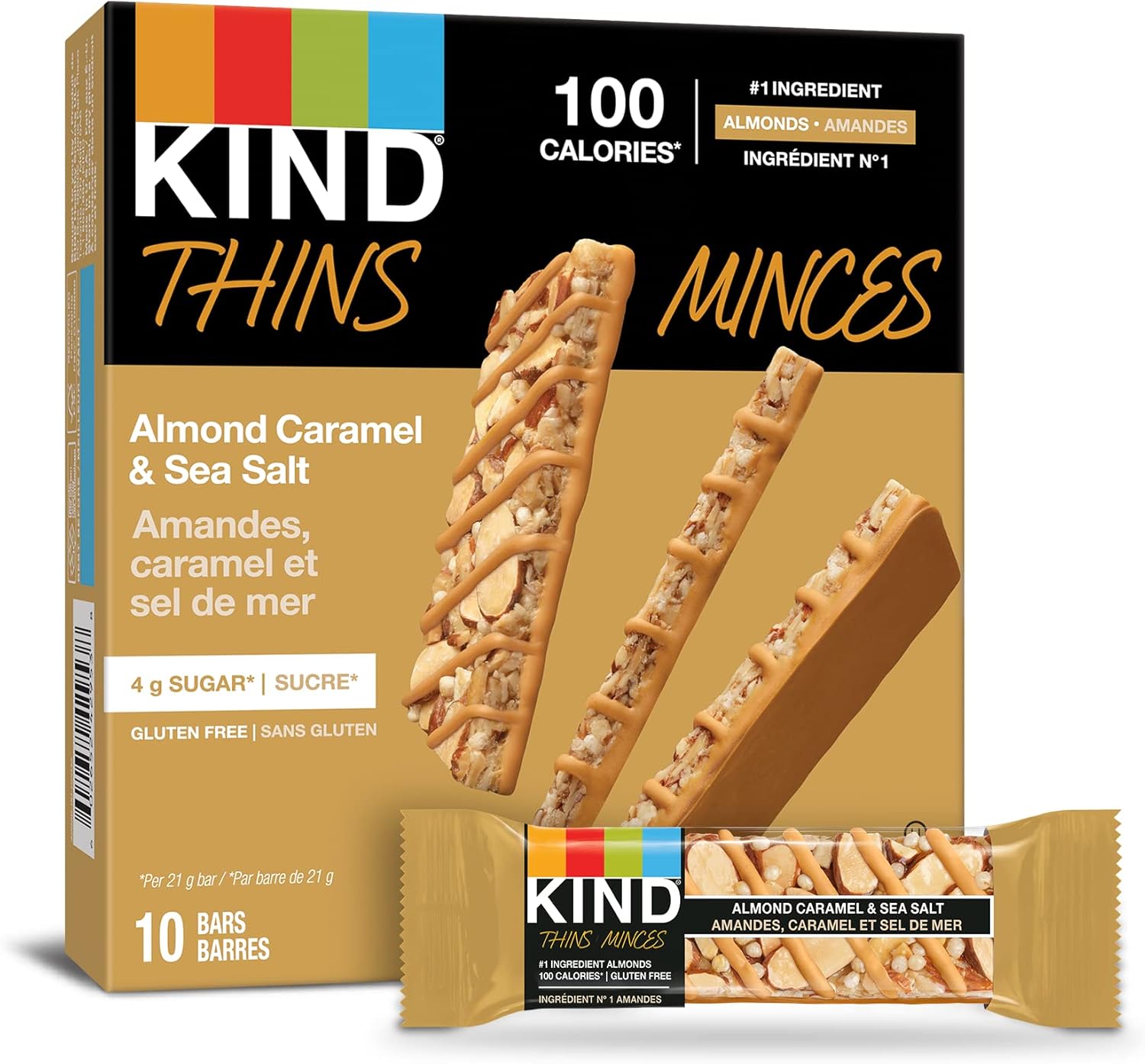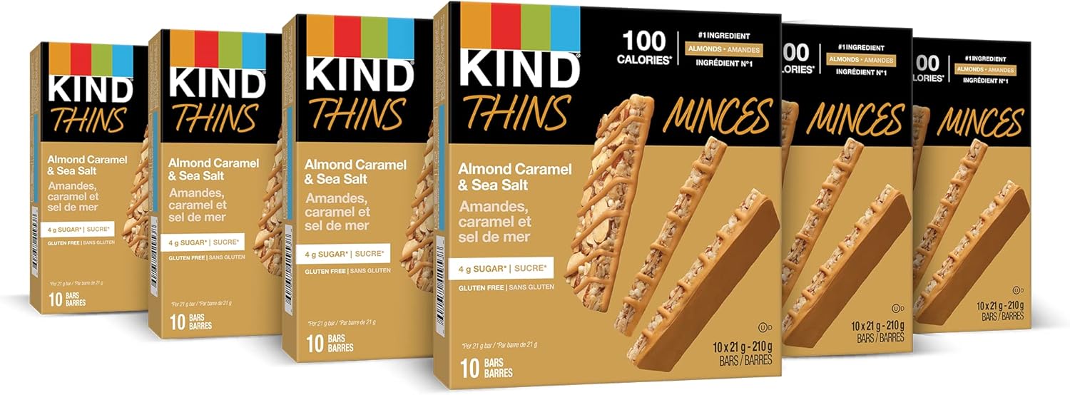 KIND THINS 焦糖杏仁海盐棒,低至100卡路里,是随时随地享用的完美零食。这款无麸质棒以杏仁为主要成分,薄薄一层杏仁片和花生丁,裹上焦糖涂层,淋上焦糖酱汁。这款营养棒含4克糖,热量为100卡路里。这款香脆薄脆的燕麦棒适合任何场合。