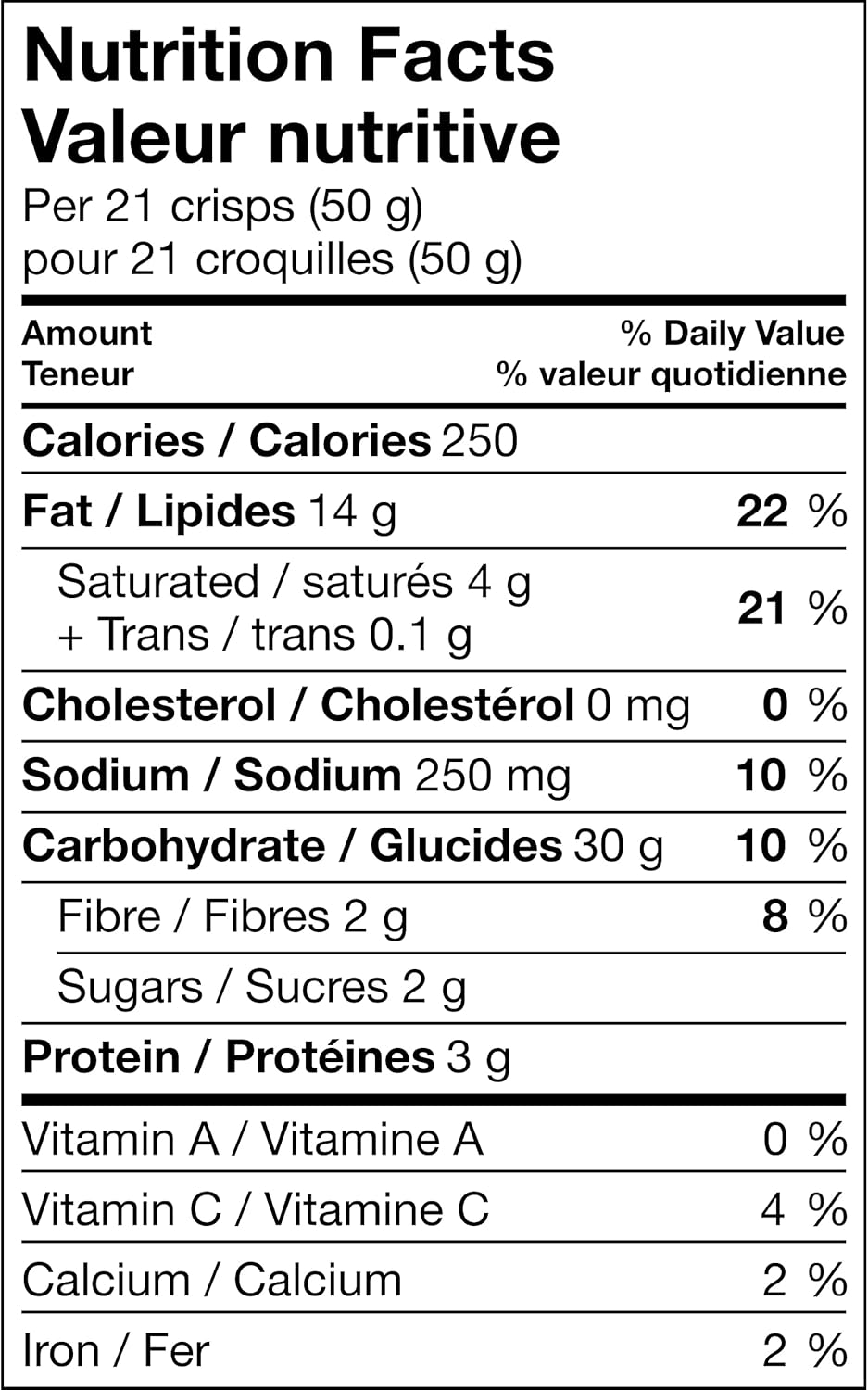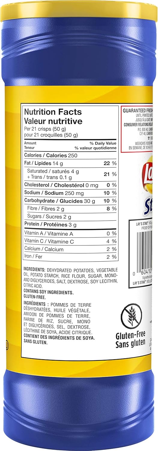 没有什么能比得上乐事Stax Original薯片的永恒美味。这款香脆的零食能满足您一直以来的味蕾,带给您梦寐以求的饱满口感。您的味蕾一定会感谢您。享用乐事Stax Original薯片,放松身心,享受美味。没有乐事的永恒美味,零食时光就不完整!乐事产品种类繁多,多年来深受加拿大人的喜爱。无麸质,0反式脂肪。