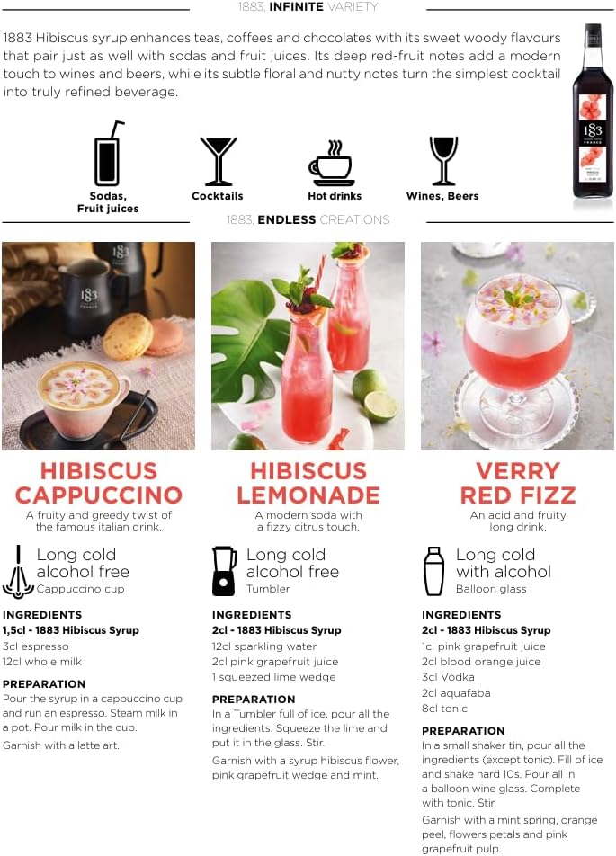 1883 糖浆是伟大厨师、葡萄酒和香水的灵感源泉,它以“法国制造”的纯粹品质,带来一场感官盛宴。纯净、简单、浓郁、强劲,这些糖浆拥有无限的诠释空间。它们定会赢得所有人的喜爱。