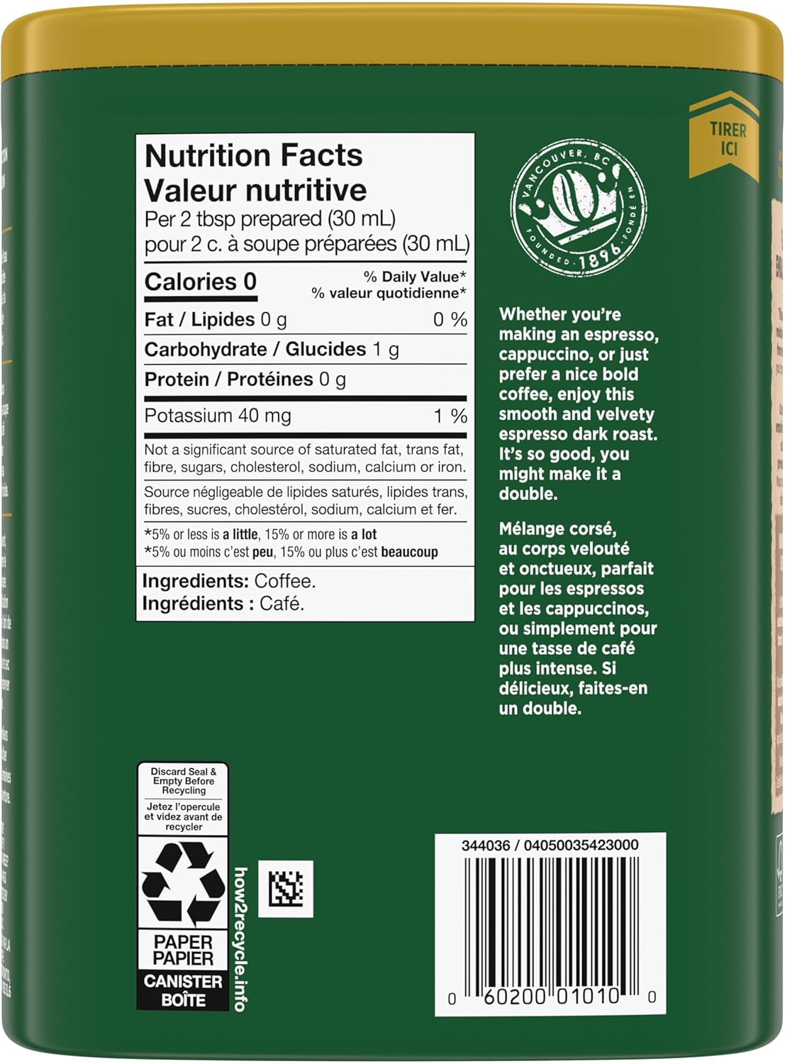 在家享用 Nabob 研磨咖啡,探索世界各地的美味。Nabob 深度烘焙浓缩咖啡研磨采用 100% 可持续来源的阿拉比卡咖啡豆制成。无论是浓缩咖啡、卡布奇诺还是浓郁咖啡,您都会喜欢这款丝滑顺滑、烘焙浓郁、带有红糖、橙子干和深色香料香气的混合咖啡。双倍用量,咖啡口感更浓郁。Nabob 研磨咖啡 100% 获得雨林联盟认证,彰显了我们对环境和优质咖啡的承诺。我们的可回收罐包装由 80% 的可再生资源纸纤维制成(不包括保鲜封条)。使用浓缩咖啡机冲泡时,每 1 盎司新鲜、冷的过滤水使用 1 平汤匙研磨咖啡。锁香包装可让您的咖啡在每杯之间保持新鲜。为保持最佳新鲜度,请在开封后一周内冲泡咖啡。我们的咖啡在加拿大安大略省烘焙和包装,并已获得犹太洁食认证。自1896年创立以来,纳博咖啡公司始终秉持着对咖啡、社区和环境的热情。