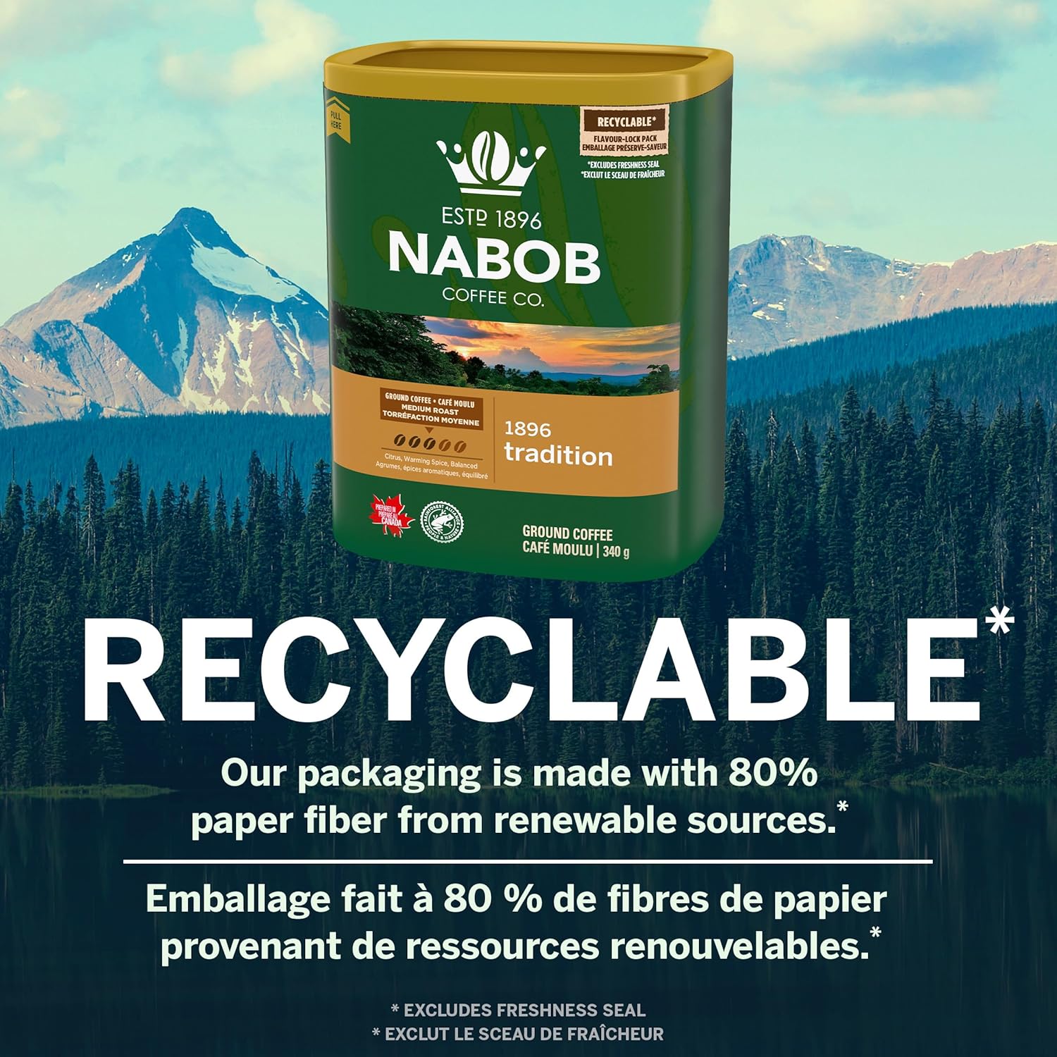 在家中,用 Nabob 研磨咖啡探索世界各地的风味。Nabob 中度烘焙 1896 传统研磨咖啡采用可持续来源的 100% 阿拉比卡咖啡豆制成。超过 115 年的专业知识帮助我们烘焙出这种完美平衡的咖啡,带有精致的可可和柑橘香气。这款混合咖啡由我们的烘焙大师原创,非常适合欣赏经典咖啡的人士。Nabob 研磨咖啡 100% 获得雨林联盟认证,彰显了我们对环境和优质咖啡的承诺。我们的可回收罐包装由 80% 来自可再生资源的纸纤维制成(不包括保鲜封)。冲泡时,每 8 盎司(250 毫升)冷的、新鲜的过滤水使用两平汤匙研磨咖啡。锁味包装可让您的咖啡在两杯之间保持新鲜。为保持最佳新鲜度,请在打开包装后一周内冲泡咖啡。我们的咖啡在加拿大安大略省烘焙和包装,并获得犹太洁食认证。自 1896 年成立以来,Nabob 咖啡公司一直致力于激发我们对咖啡、社区和环境的热情。
