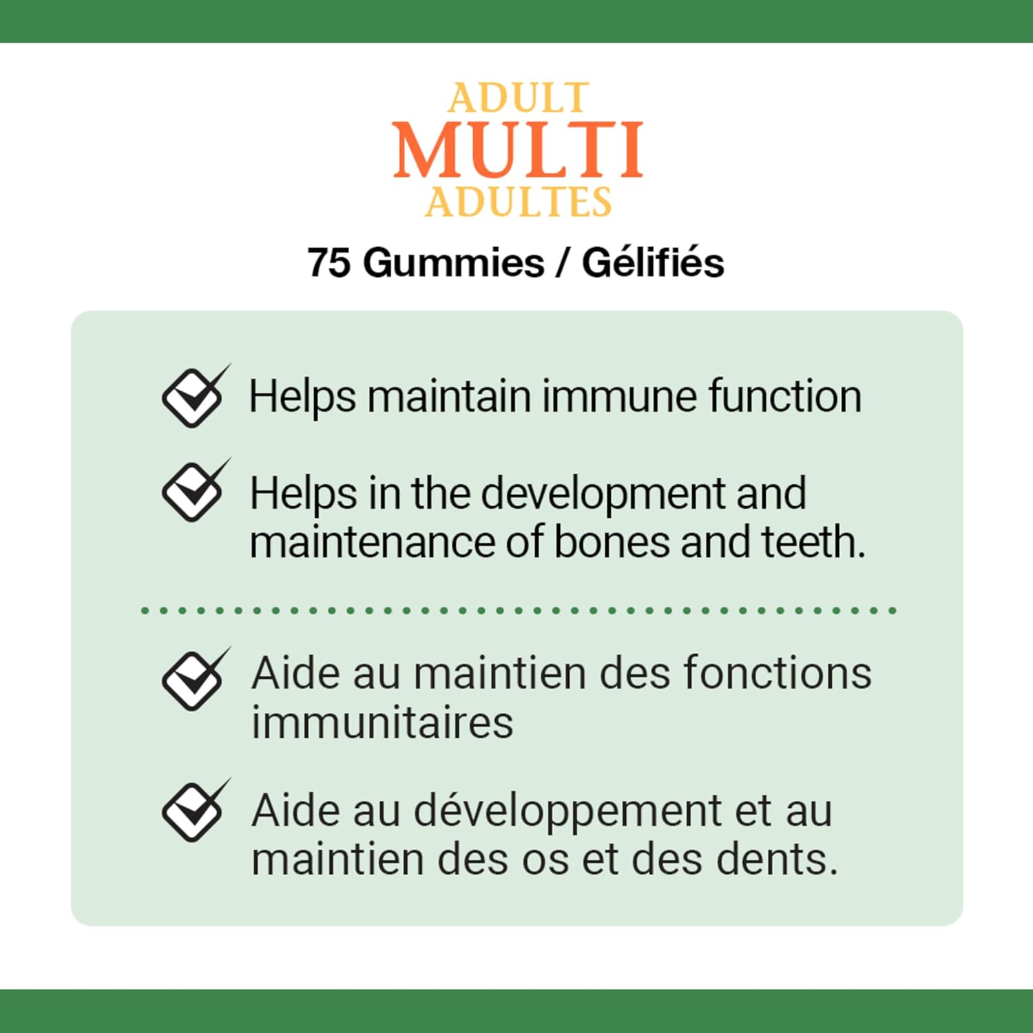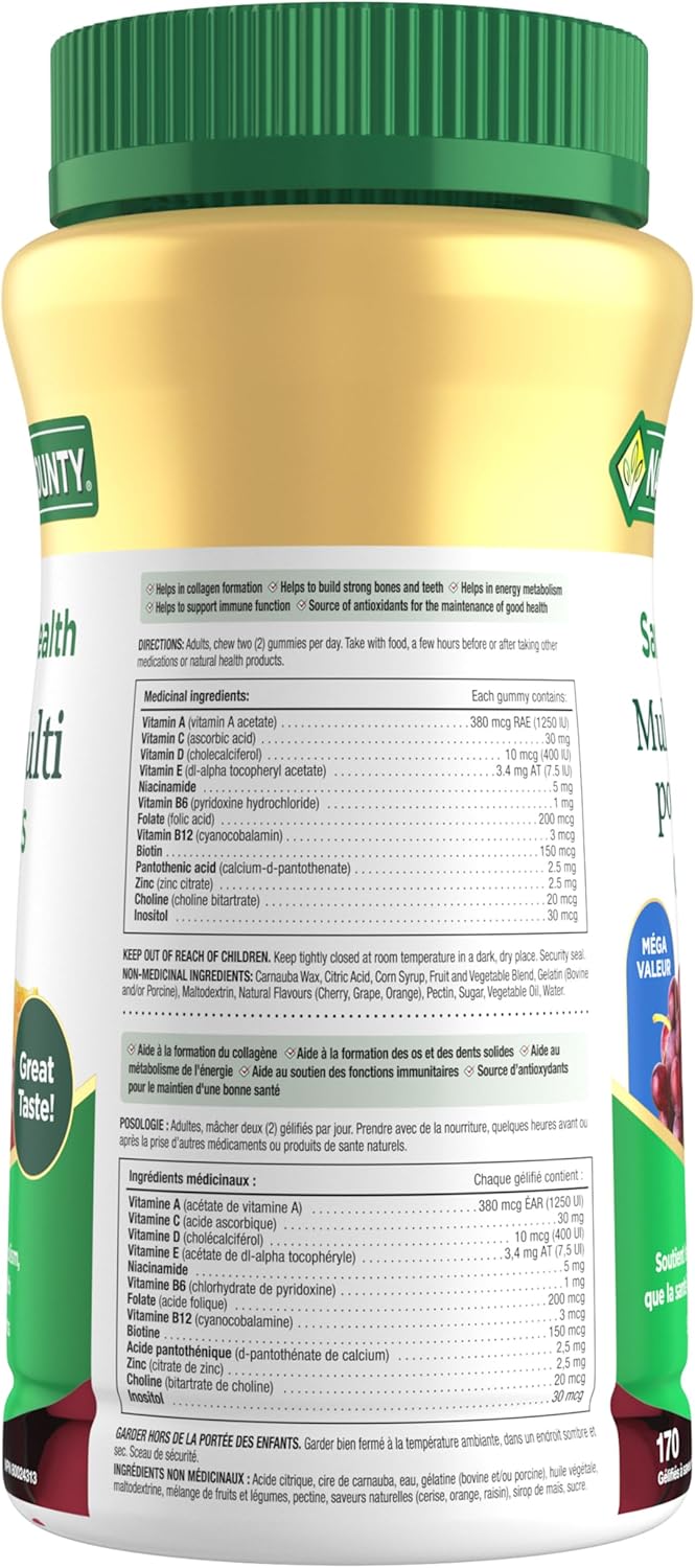 40多年来,NATURE'S BOUNTY 始终以您为中心,研发维生素和营养补充剂。您服用维生素是为了帮助身体保持最佳状态——那么,何必纠结于其他品牌的维生素呢?今天就来试试 NATURE'S BOUNTY 吧!NATURE'S BOUNTY 成人复合维生素软糖有助于维持成人免疫功能,并促进骨骼和牙齿的发育和维护。每粒软糖含有 375 微克维生素 A、30 毫克维生素 C、10 微克维生素 D、3.4 毫克维生素 E、5 毫克烟酰胺、1 毫克维生素 B6、200 微克叶酸、3 微克维生素 B12、150 微克生物素、2.5 毫克泛酸、2.5 毫克锌、20 微克胆碱和 30 微克肌醇。这些樱桃、葡萄和橙子口味的软糖美味可口,比药丸更容易服用。成人每日服用两 (2) 粒软糖。可与食物同服,也可在服用其他药物或天然保健品前或后几小时服用。