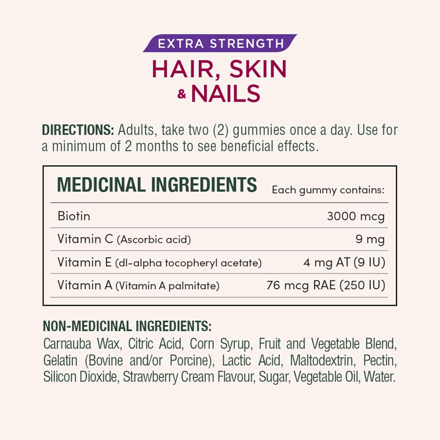 40 多年来,NATURE'S BOUNTY 始终以您为中心,研发维生素和营养补充剂。您服用维生素是为了帮助身体保持最佳状态——何必纠结于其他维生素品牌呢?立即试用 NATURE'S BOUNTY。NATURE'S BOUNTY 强效护发、护肤、护指甲软糖含有超过 2 倍的生物素*,有助于维持正常头发和皮肤的健康,促进指甲更浓密健康,以及头发更强壮浓密。此外,它还有助于增强免疫功能。每粒软糖含有 3000 微克生物素、9 毫克维生素 C、4 毫克 AT(9 国际单位)维生素 E 和 76 微克 RAE(250 国际单位)维生素 A。这些草莓奶油味软糖美味可口,比药片更容易服用。成人每日服用两 (2) 粒软糖。至少服用 2 个月即可见效。* 每份 6000 微克