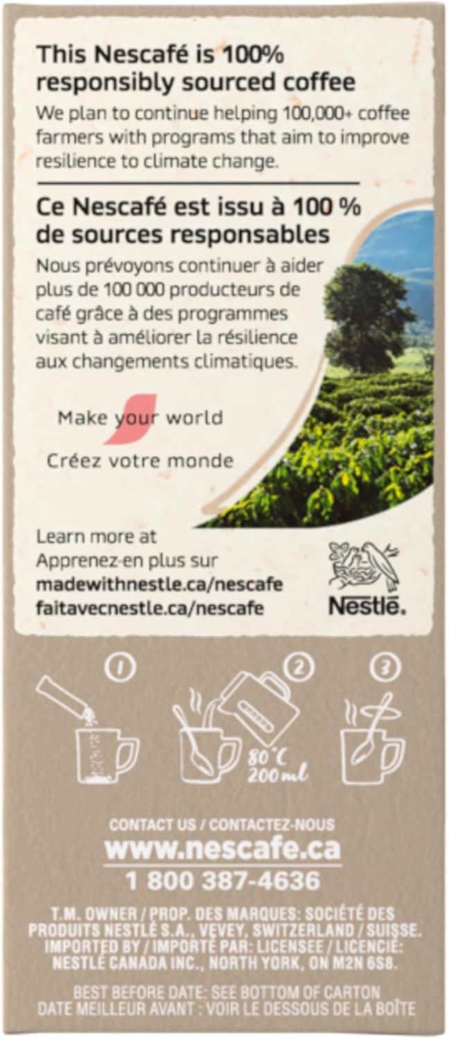 雀巢速溶奶油咖啡粉可制作出一杯美味香浓的咖啡!雀巢速溶奶油咖啡粉每次冲泡都味道鲜美,因为每袋独立包装的咖啡和奶精的含量都恰到好处。冲泡时,将一袋速溶咖啡倒入杯中,加入 200 毫升热水,根据口味加糖,搅拌后即可享用一杯香浓香醇的美味咖啡。雀巢速溶奶油咖啡粉口感顺滑,咖啡香气浓郁 - 是居家、办公室或外出时的完美选择,让每个人都能随时随地享用自己喜爱的咖啡。雀巢速溶奶油咖啡粉采用 100% 负责任采购的咖啡制成。雀巢计划继续帮助超过 100,000 名咖啡农,开展旨在提高其应对气候变化能力的项目。雀巢 - 创造您的世界。