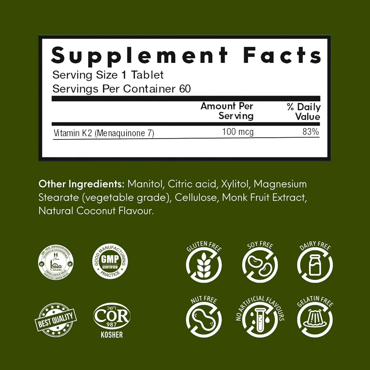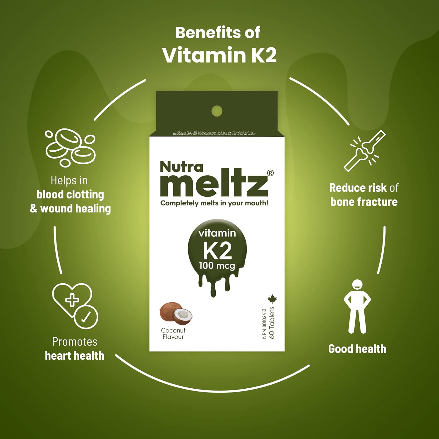 Nutrameltz 维生素 K2 100 微克 - 维生素 K2 作为 MK7 补充剂,用于强化牙齿、骨骼、促进心脏健康,速溶片,用于治疗维生素 K2 缺乏症 - 椰子味(60 片)