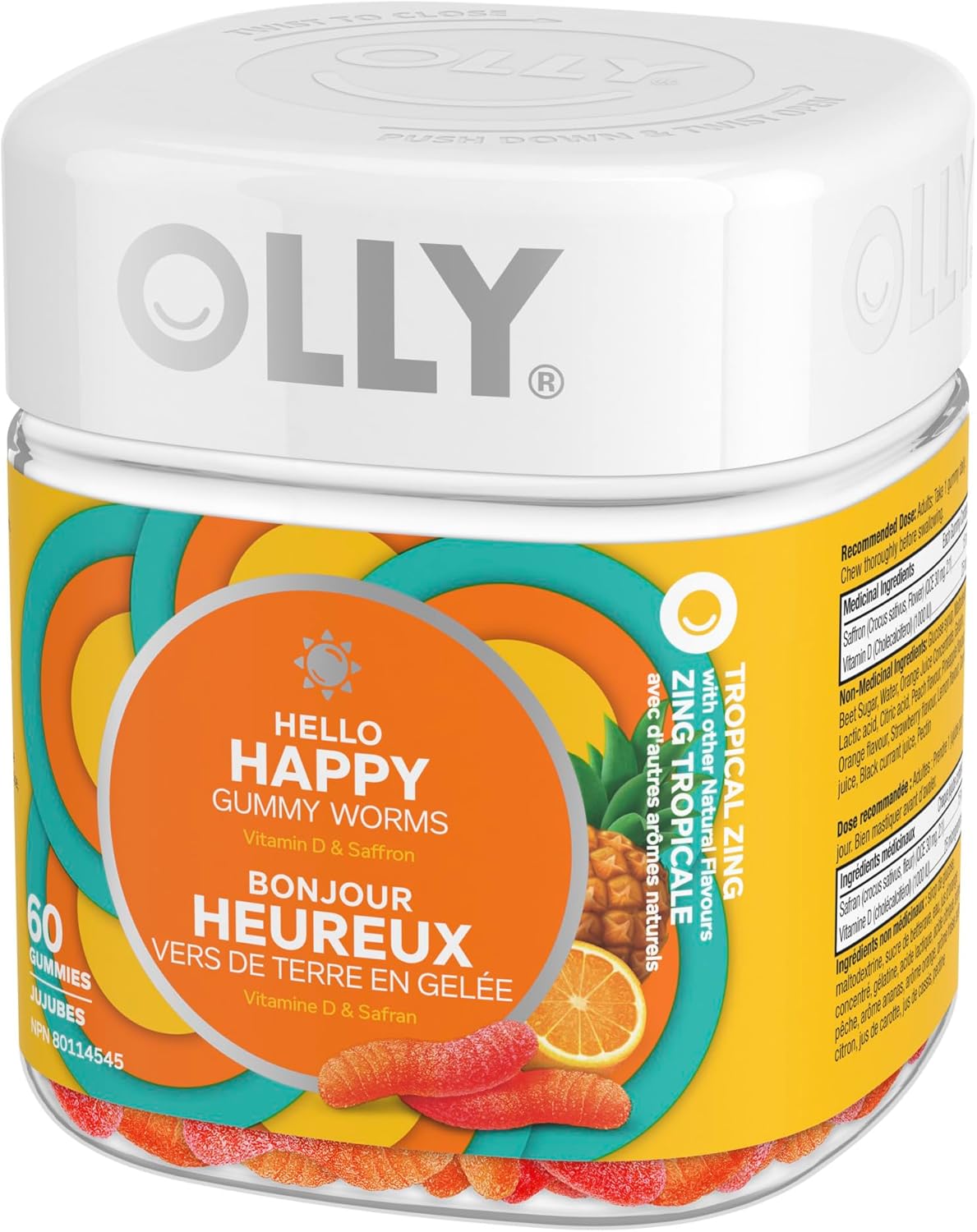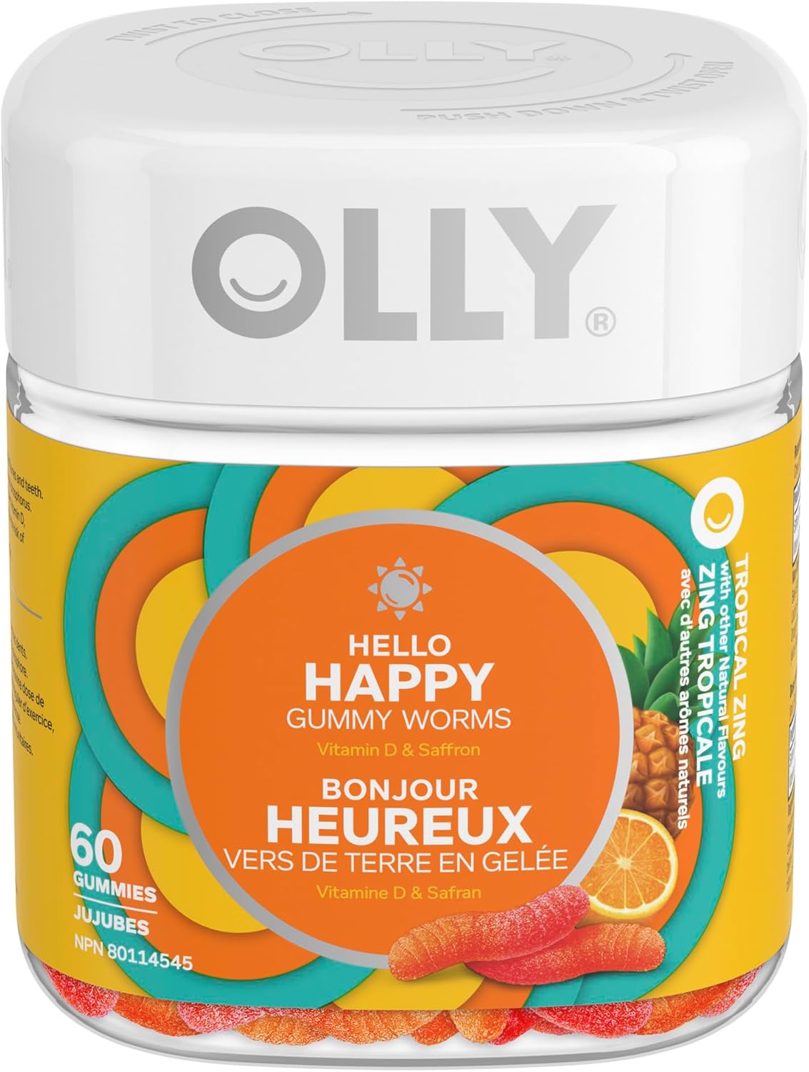 产品 1:OLLY Hello Happy:这款 OLLY 热带活力软糖蠕虫补充剂,蕴含平衡情绪的藏红花和令人愉悦的维生素 D*,为您带来一剂愉悦的良药,让您心情愉悦。
