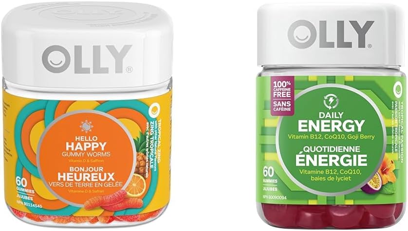 OLLY Hello Happy Gummy Worm 补充维生素热带风味和维生素 D 和每日能量软糖补充剂的混合物 100% 无咖啡因能量维生素热带激情混合物