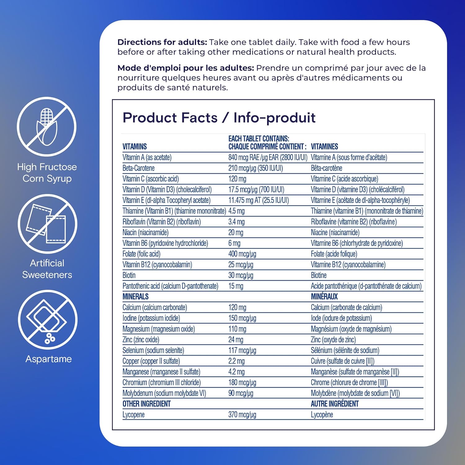 您不在乎年龄,您可以按照自己一贯的方式生活!使用 One A Day 50 岁以上男性复合维生素来支持您的营养,这是一种特别为 50 岁以上男性配制的完整复合维生素,旨在支持衰老的主要问题。在我们经历这个我们称之为生命的奇妙旅程时,我们的营养需求自然会发生变化。One A Day 50 岁以上男性复合维生素含有多种必需维生素和矿物质,旨在帮助支持:骨骼健康 - 帮助骨骼和牙齿的发育和维持免疫健康 - 帮助维持免疫功能健康的皮肤和头发 - 保持健康的头发、皮肤和指甲眼睛健康 - 帮助维持视力肌肉功能 - 帮助维持正常的肌肉功能新陈代谢 - 帮助体内的能量代谢抗氧化剂有益健康 - 抗氧化剂的来源,有益于维持身体健康您的身体可能需要必需的维生素,如 A、B6、B12 C、D 和 E;以及钙、硒和锌等矿物质,One A Day 针对 50 岁及以上男性的复合维生素补充剂,一片即可补充 100% 的每日推荐摄入量(16 种维生素和矿物质)*。服用 One A Day 50+ 男性维生素是让您展现最佳状态的另一项措施。每片都含有您所需的必需维生素和矿物质,有助于保持身体健康,同时不含高果糖玉米糖浆、阿斯巴甜和人工甜味剂。为什么不今天就将 One A Day 50 岁以上男性复合维生素纳入您的健康生活方式呢!*维生素和矿物质摄入量基于加拿大卫生部的每日推荐摄入量。成人服用方法:每日一片,随餐服用,在服用其他药物或天然保健品前或后几小时服用。为确保本产品适合您,请务必阅读并遵循标签说明。