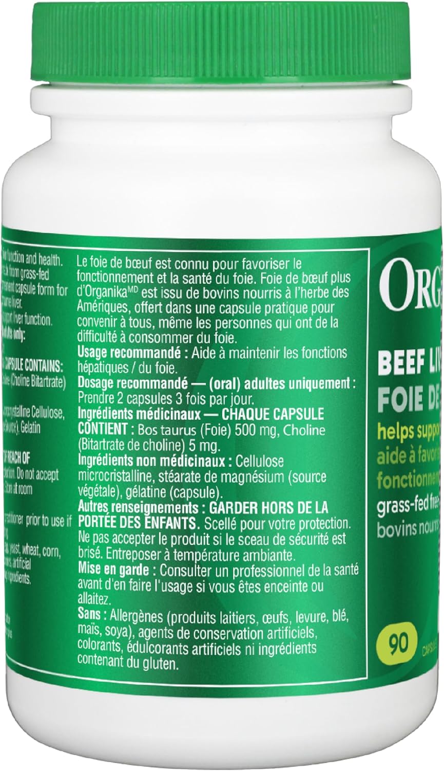 Organika 牛肝加胆碱 - 源自草饲牛和育肥牛,牧场饲养,富含维生素和矿物质,支持肝功能、能量水平和免疫力 - 90 粒胶囊