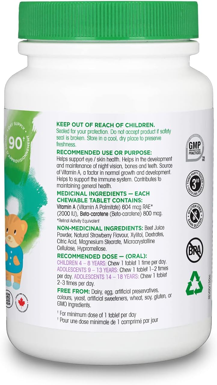Organika 儿童视力咀嚼片草莓味 - 维生素 A、β-胡萝卜素,支持功能和发育 - 90 片