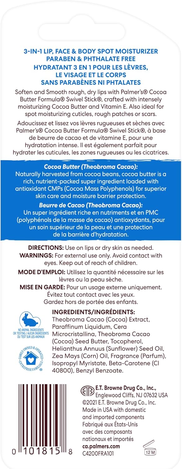 Palmer's 可可脂旋转棒是您化妆包中的必备单品,它是一款多功能的美容利器!从滋润干裂的角质层,到滋润干燥的双唇,再到抚平散落的毛发,这款旋转棒的便携尺寸非常适合您随身携带,帮助您应对日常烦恼。它既可以用作润唇膏,缓解嘴唇干裂,也可以作为局部护理,用于干燥的肘部或膝盖,还能提供 48 小时的保湿效果,舒缓抚平痕迹和疤痕。Palmer's 是值得信赖的品牌,拥有 180 多年的历史,提供代代相传的高品质天然产品。作为美国排名第一的可可脂品牌,Palmer's 可可脂配方采用最高品质的天然成分,为肌肤从头到脚带来卓越的保湿效果。