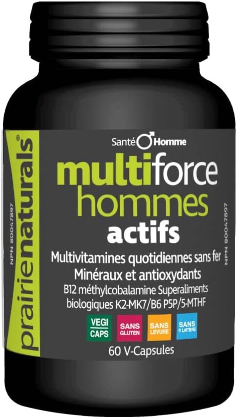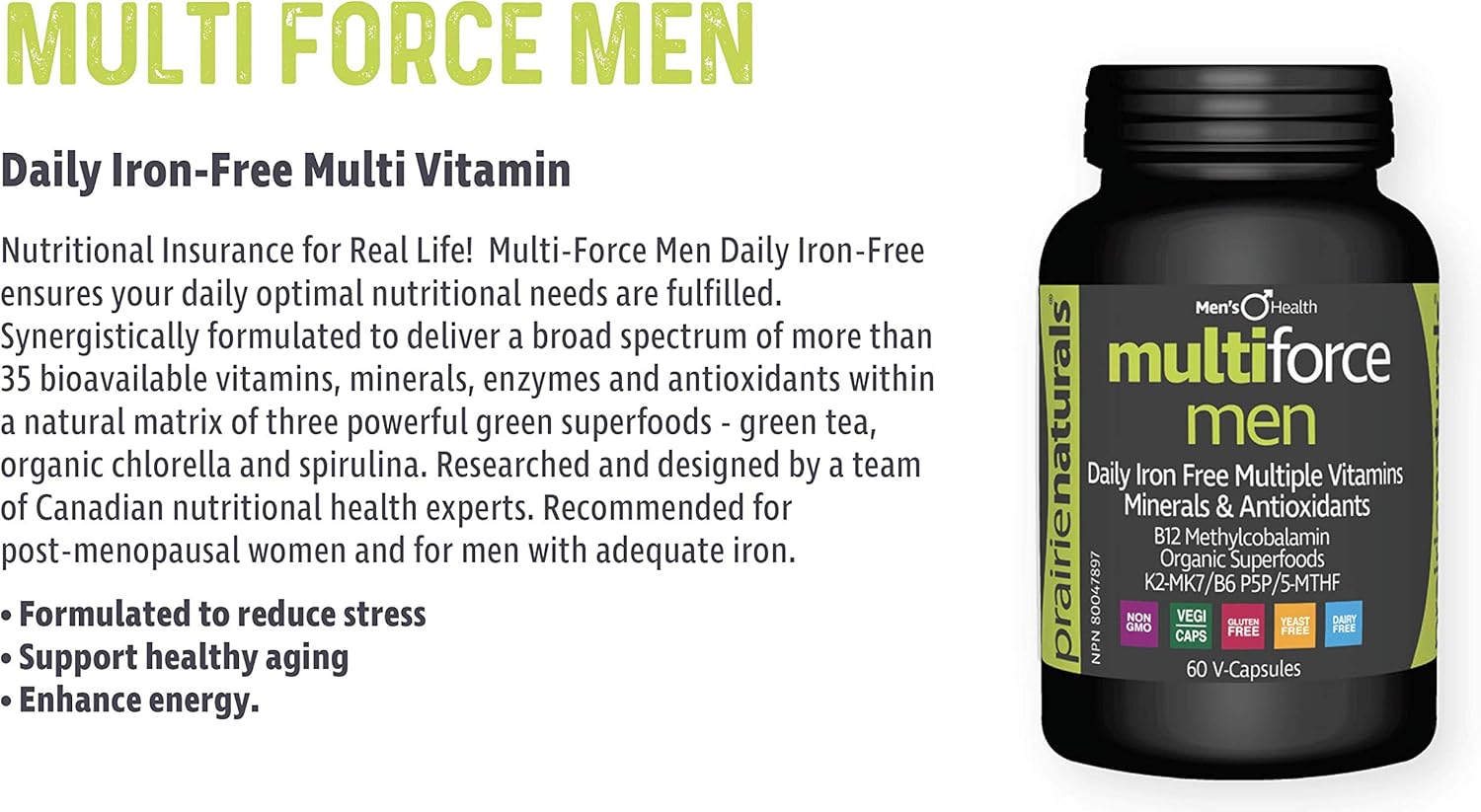 Prairie Naturals 多效男士活力配方。不含铁。富含多种维生素B群(甲钴胺B12、P5P B6、5MTHF)、MK7 维生素K2、矿物质复合物(含锌)、甜菜碱盐酸盐和菠萝蛋白酶(促进吸收)、有机小球藻……