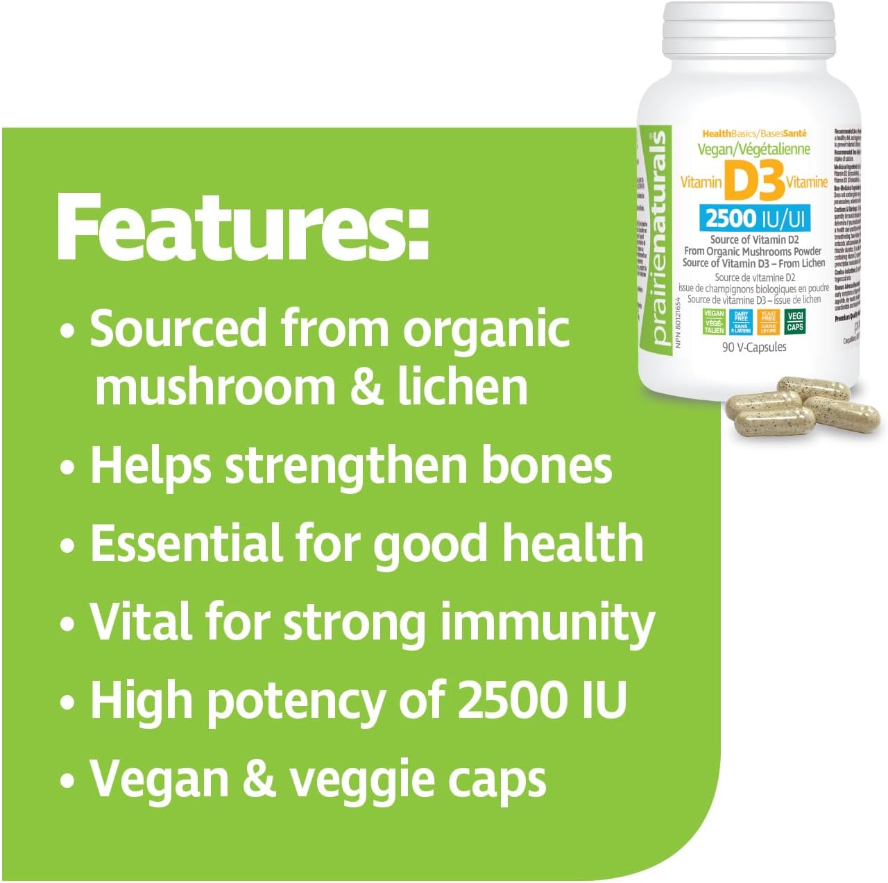 加拿大最受欢迎的维生素 D 品牌推出纯素维生素 D 2500 IU!Prairie Naturals 纯素维生素 D 2500IU 萃取自可持续植物来源,其中维生素 D3 源自地衣,D2 源自有机蘑菇,适合纯素食者和素食者。