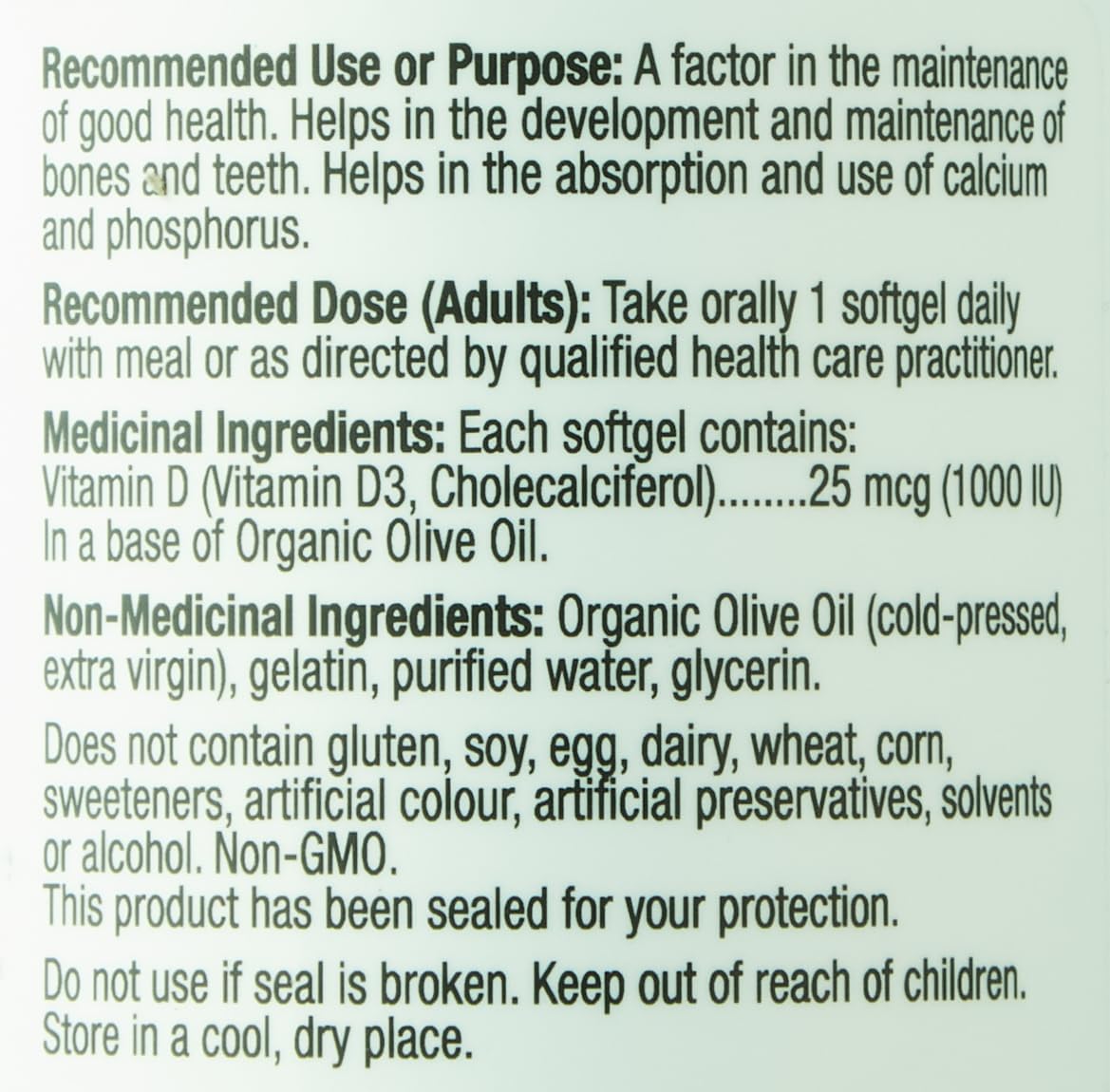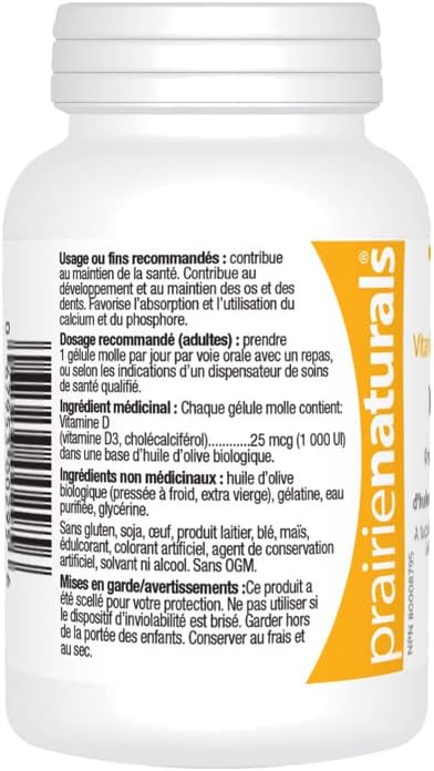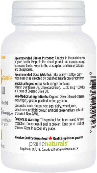 Prairie Naturals 维生素 D3 胆钙化醇 1,000 IU 有机特级初榨橄榄油软胶囊 - 180 粒