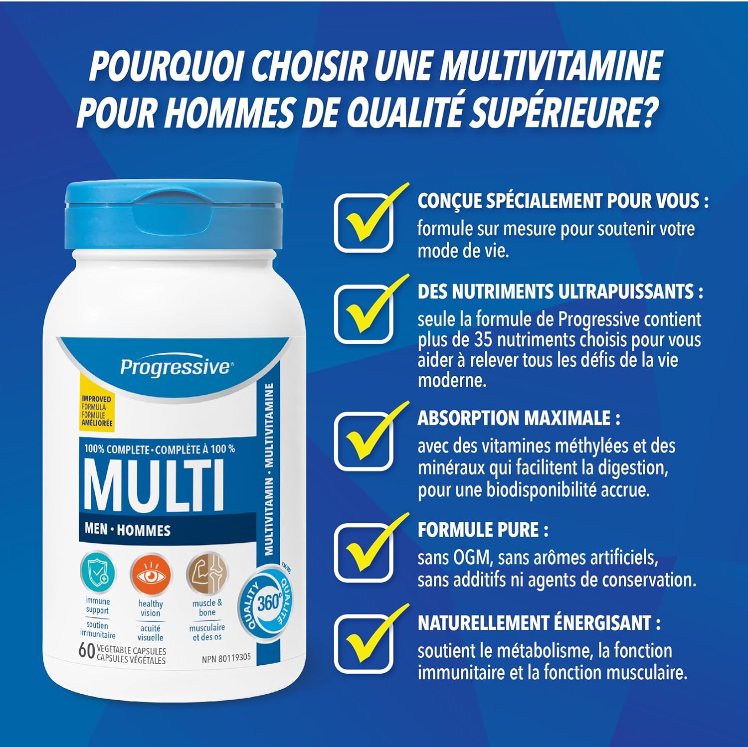 Progressive 100% 成人男士复合维生素满足“正常”现代生活方式的营养需求。对于那些不经常运动、承受中等压力且不经常忙碌的人来说,Progressive 成人男士复合维生素是理想之选。这款改良配方富含多种辅助营养素,旨在满足男性的健康需求。这些辅助营养素包括锯棕榈、胡芦巴和玛卡。