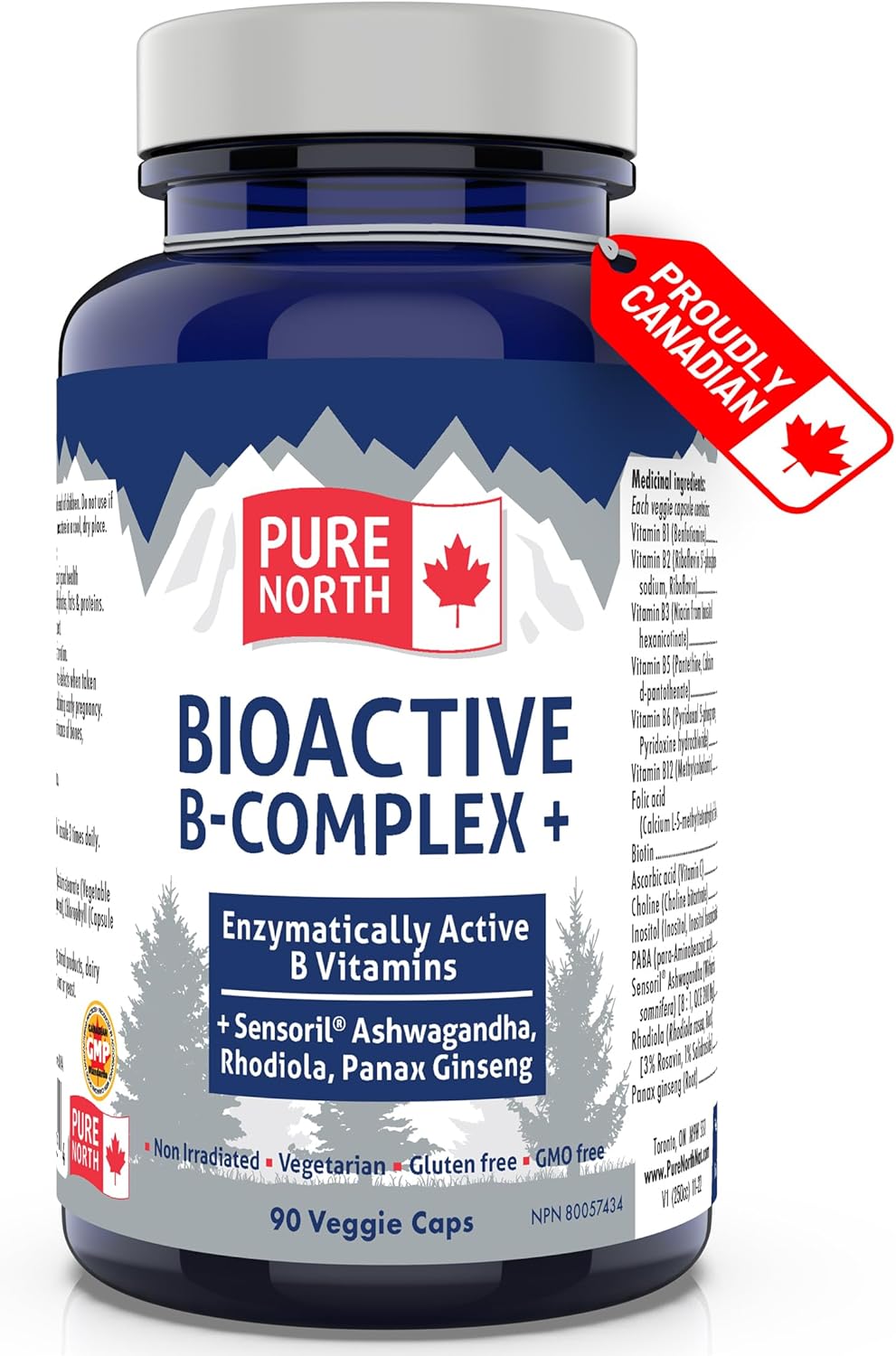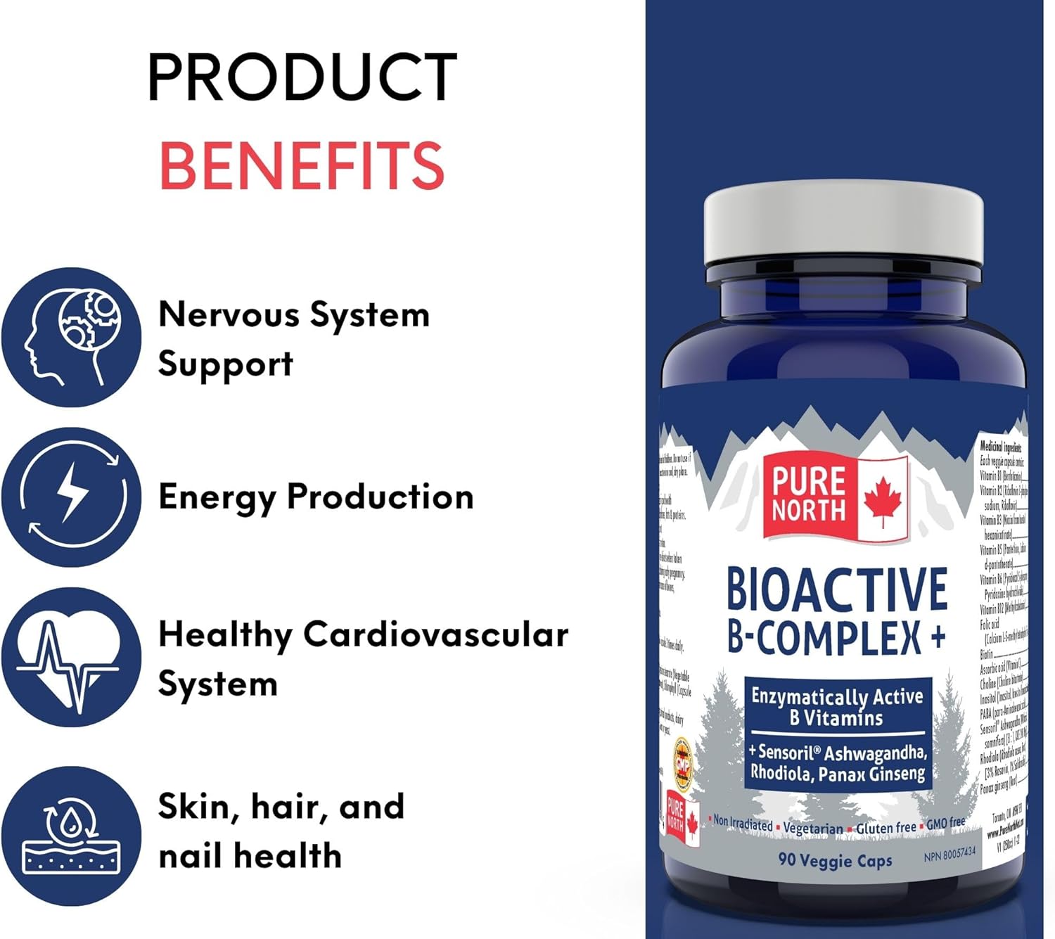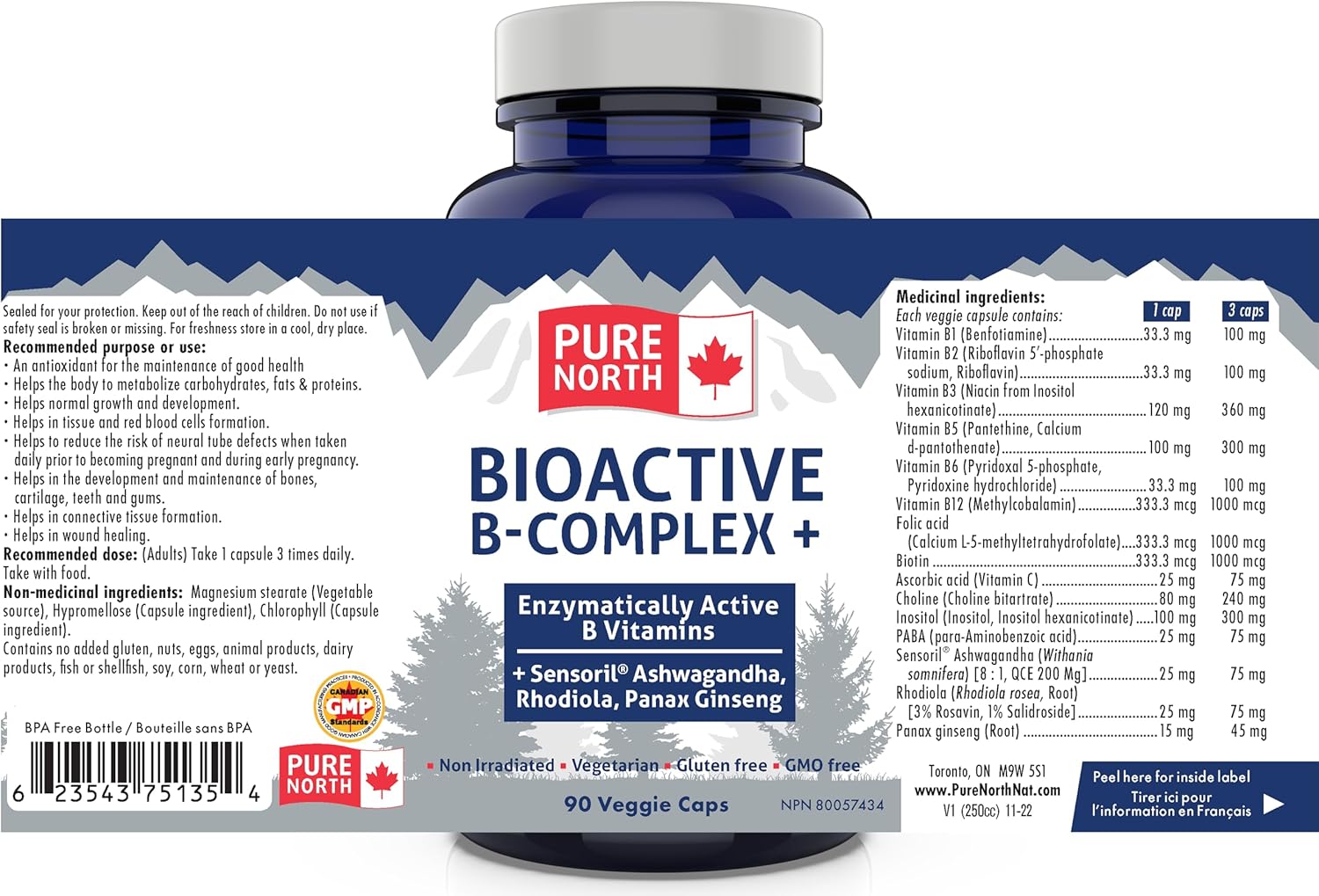 Pure North Naturals - 生物活性 B 族维生素补充剂 90 粒胶囊,30 天用量 - 酶活性 Sensoril 南非醉茄、红景天、人参 - 经第三方测试 - 加拿大配制和制造