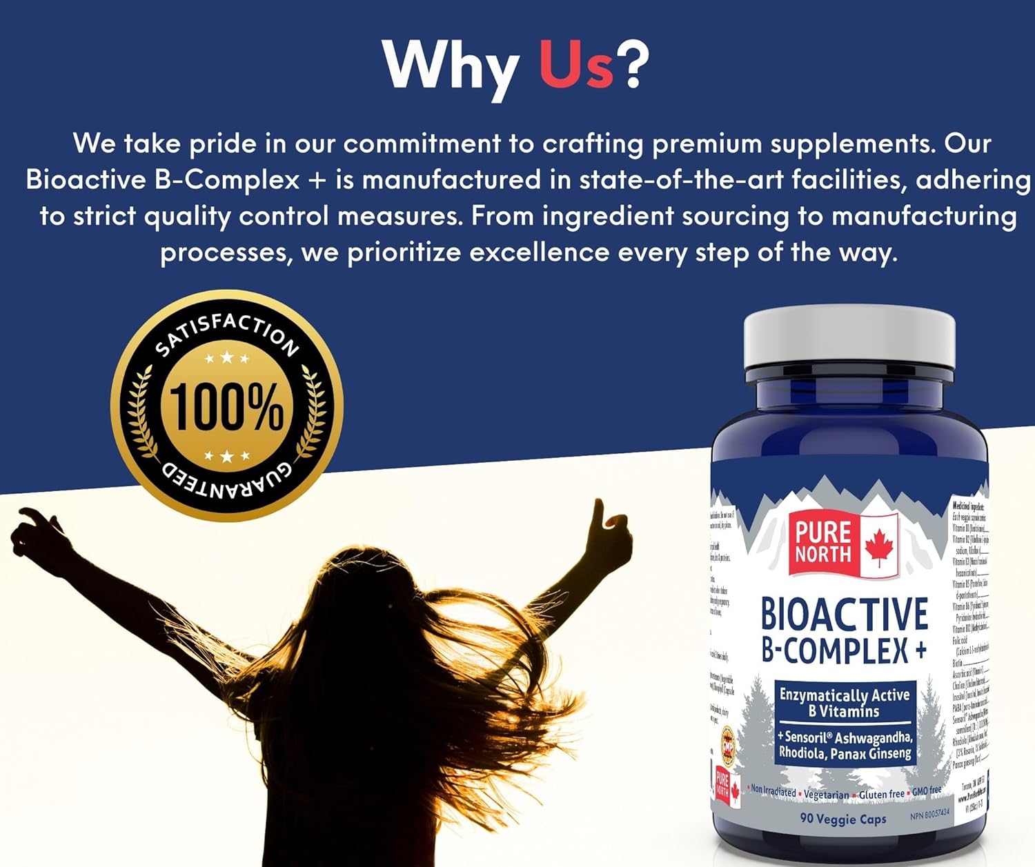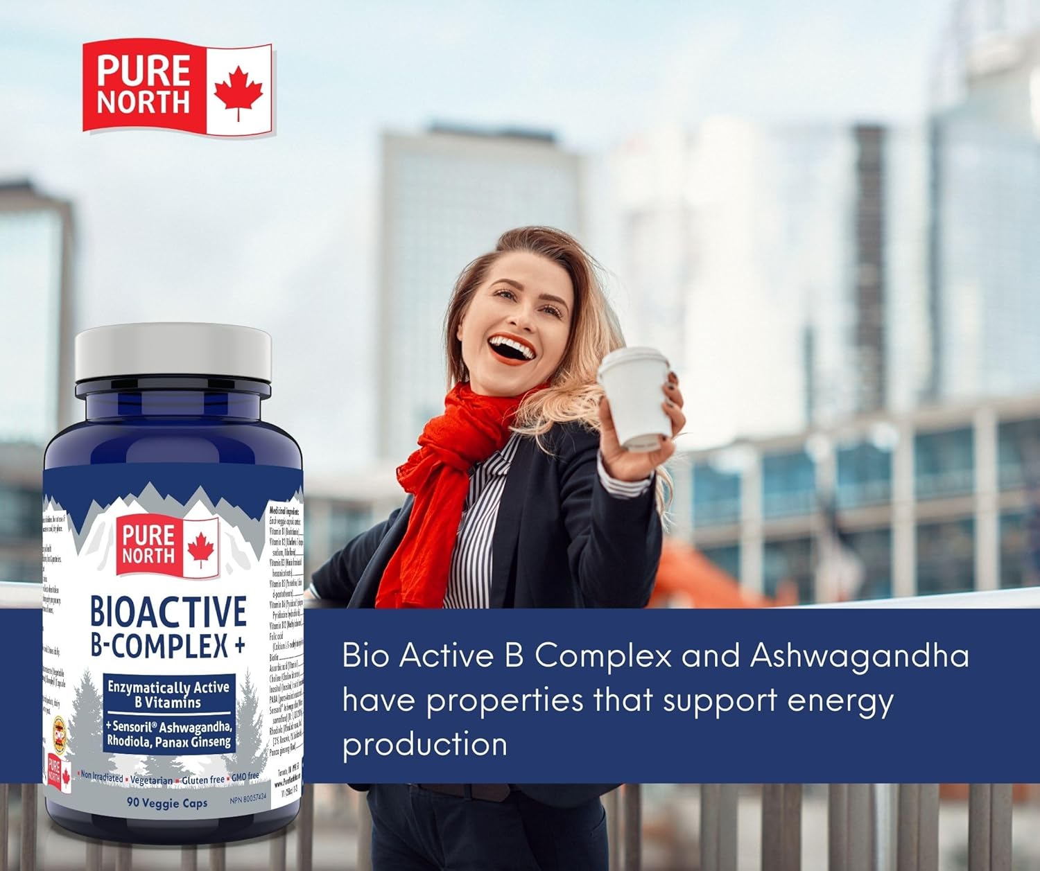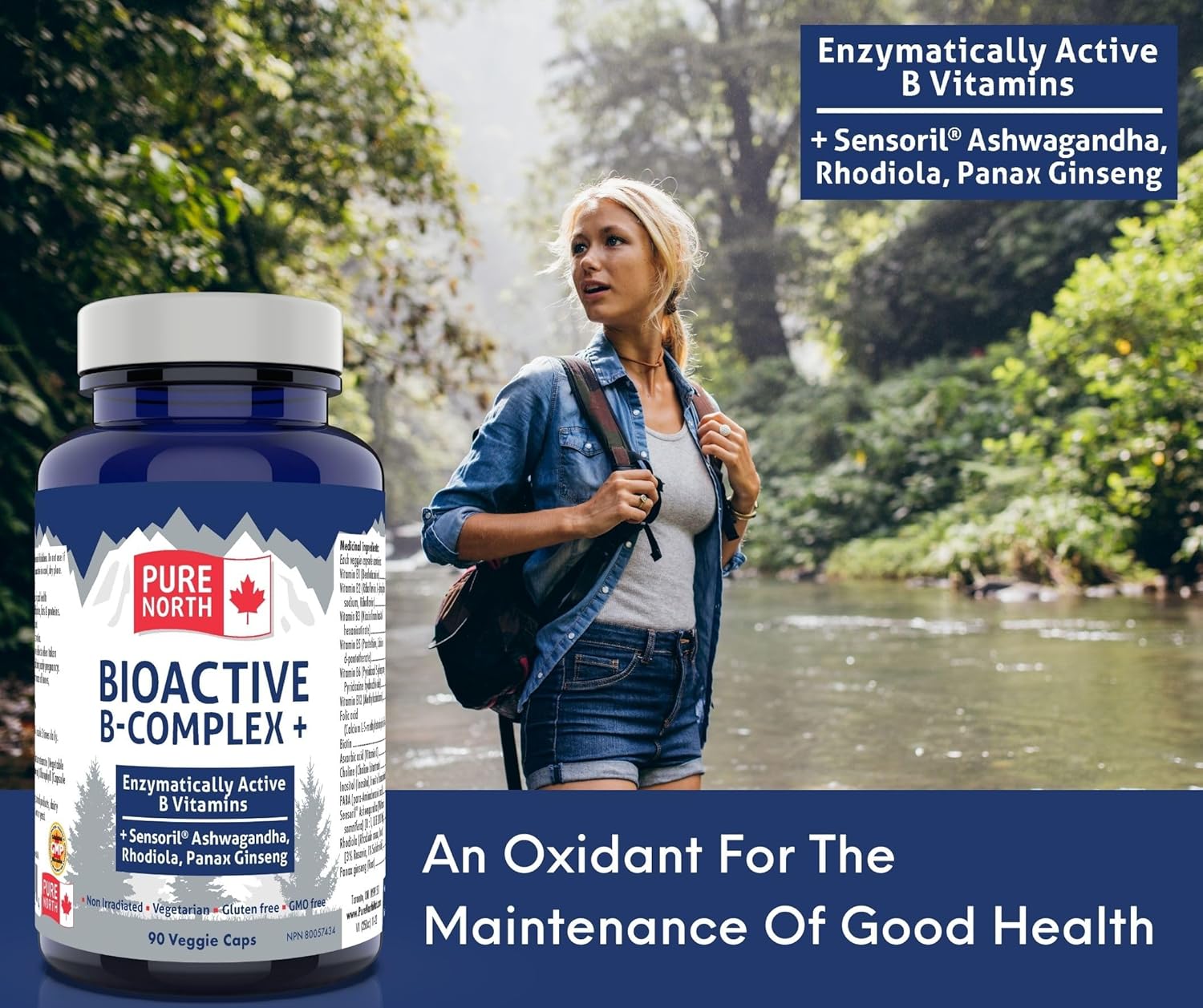 Pure North Naturals - 生物活性 B 族维生素补充剂 90 粒胶囊,30 天用量 - 酶活性 Sensoril 南非醉茄、红景天、人参 - 经第三方测试 - 加拿大配制和制造