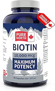 Pure North Naturals 生物素 10,000 微克 90 粒胶囊,90 天供应,促进活力生长和光泽 - 纯素、非转基因和无麸质 - 健康的头发、皮肤和指甲 - 支持大脑功能和心血管系统