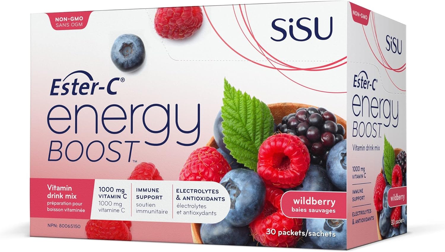 Sisu 能量提升,含酯化维生素 C、浆果、24 小时免疫支持、维生素 C 饮料粉、活力 B 族维生素和电解质,30 个独立包装,纯素、非转基因、无麸质、无乳制品