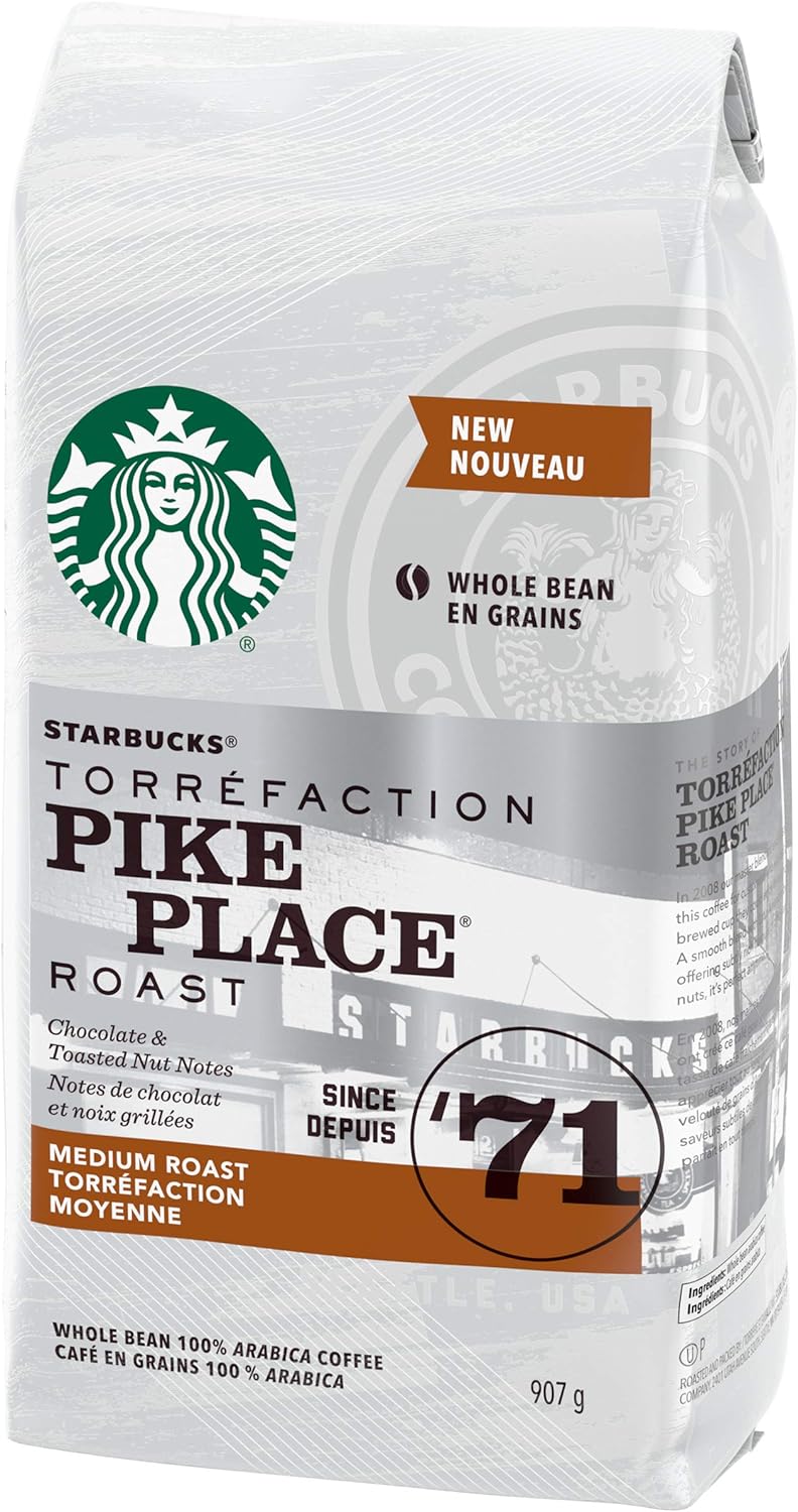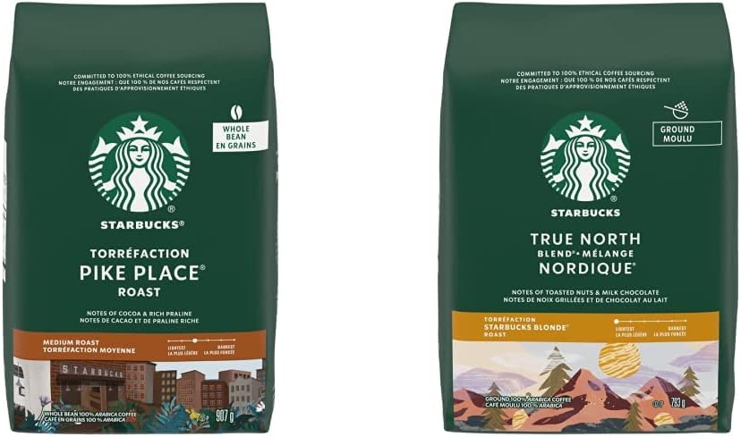 星巴克派克市场全豆中度烘焙咖啡,907 克 顺滑、浓郁、均衡的星巴克派克市场烘焙咖啡是我们最受欢迎的中度烘焙咖啡之一,深受加拿大咖啡爱好者的喜爱,是他们清晨习惯和下午茶歇的一部分。派克市场烘焙咖啡采用 100% 阿拉比卡咖啡豆和拉丁美洲咖啡豆,搭配精致浓郁的巧克力和烤坚果风味,是我们对 1971 年在西雅图派克市场开设的第一家门店的挚爱之作。这种日常烘焙体现了我们对全球顾客的承诺,让他们可以随时享用新鲜煮制的咖啡。星巴克 True North 混合研磨咖啡,金色烘焙,793 克 四十年的咖啡烘焙经验激励着我们的烘焙大师不断完善星巴克金色烘焙——一种更轻盈、更柔和的星巴克烘焙。这款精选拉丁美洲咖啡豆的混合烘焙时间更短,令柔和的可可和轻度烘焙坚果的细腻香气得以充分绽放。这款咖啡口感醇厚却不失浓郁,冲泡出一杯令人愉悦的优雅咖啡,是招待朋友或迎接新一天的完美之选。True North Blend 搭配巧克力曲奇或山核桃卷更是绝佳之选。这款咖啡采用我们咖啡馆使用的同款优质 100% 阿拉比卡咖啡豆,研磨成通用配方,适用于任何滴滤咖啡机、手冲咖啡机或法式压滤咖啡机。