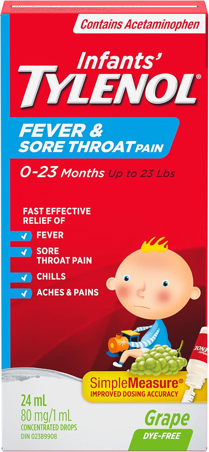 婴儿泰诺退烧止痛滴剂,24 毫升,可快速有效缓解发烧和咽喉痛。这款浓缩滴剂可快速有效缓解0-23个月或体重不超过23磅(约10公斤)的婴儿发烧、咽喉痛和全身疼痛。50多年来,泰诺一直深受家长和医生的信赖,因其有效缓解疼痛和发烧,同时又不伤胃。婴儿泰诺无葡萄色素退烧止痛滴剂采用Simplemeasure技术,这是一种专门设计的剂量计量技术,旨在提高准确性并减少溢出的可能性。对于23个月以下的婴儿,请在使用前摇匀。为了准确给药,请仔细遵循说明。使用随附的注射器,并在图表上找到正确的剂量。如果可能,请按体重服用,否则请按年龄服用。仅使用提供的注射器。将液体缓慢地倒入儿童口中,或与任何液体或软食混合服用。根据需要,每4至6小时可重复服用一次。 24 小时内不要服用超过 5 剂。