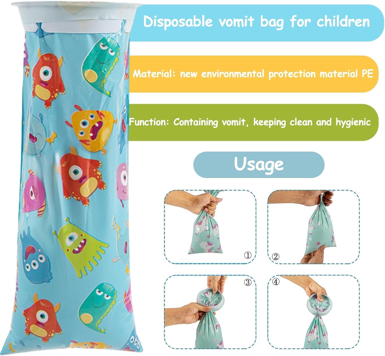 产品规格: 材质:PE 尺寸:16.5*35cm 款式:小怪兽,小马 颜色:如图 容量:1500毫升 数量:16个(每种款式8个) 产品特点: 我们的16个呕吐袋是旅行的理想伴侣。无论是在汽车,轮船还是飞机上,这些高品质的唾液袋都能提供可靠的保护。一体式环可实现安全的固定和闭合。有两种不同类型的卡通图案,深受儿童和成人的欢迎 合适的容量:这种尿袋的最大容量为1500毫升,非常丰富。这些一次性呕吐袋是汽车垃圾袋,垃圾袋和一次性尿袋的最佳替代品。呕吐袋可用于醉酒,头晕,怀孕和生病的情况。体积小,重量轻,易于在任何地方使用,非常适合旅行。
