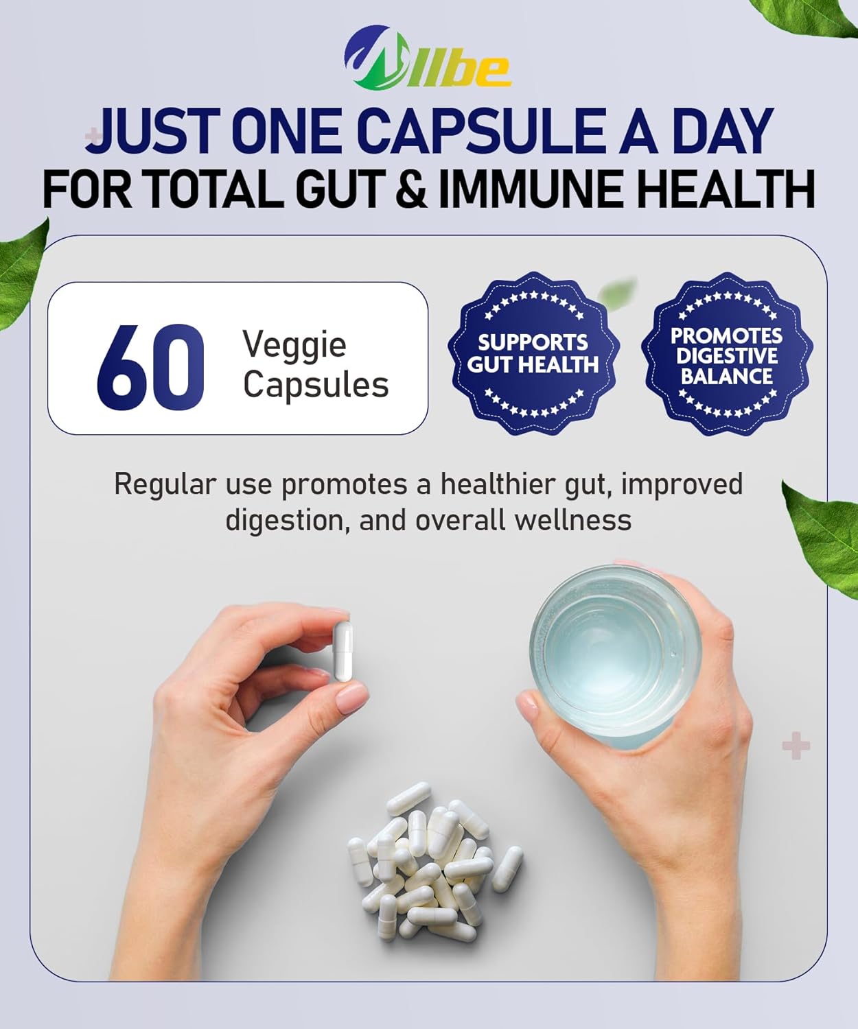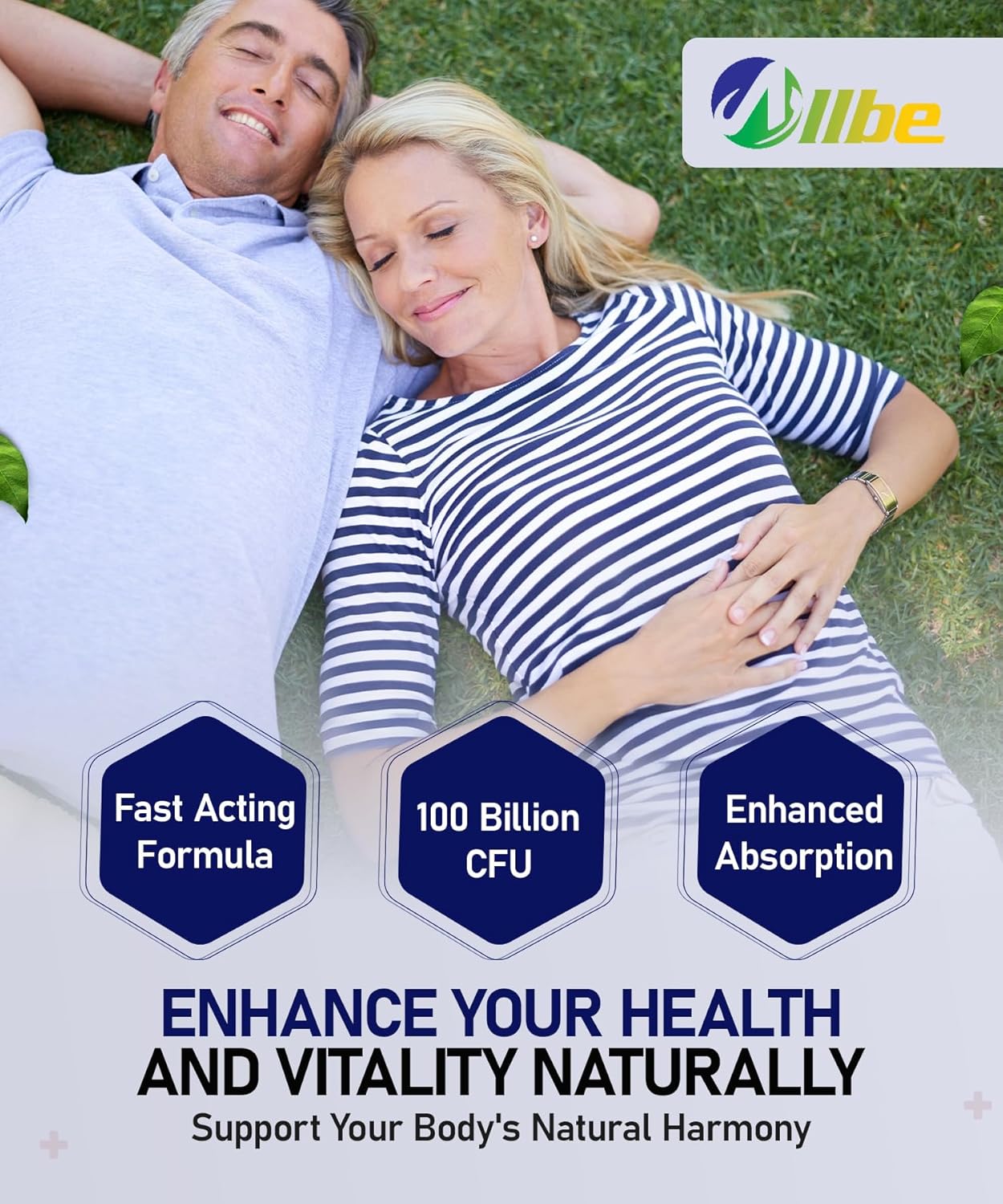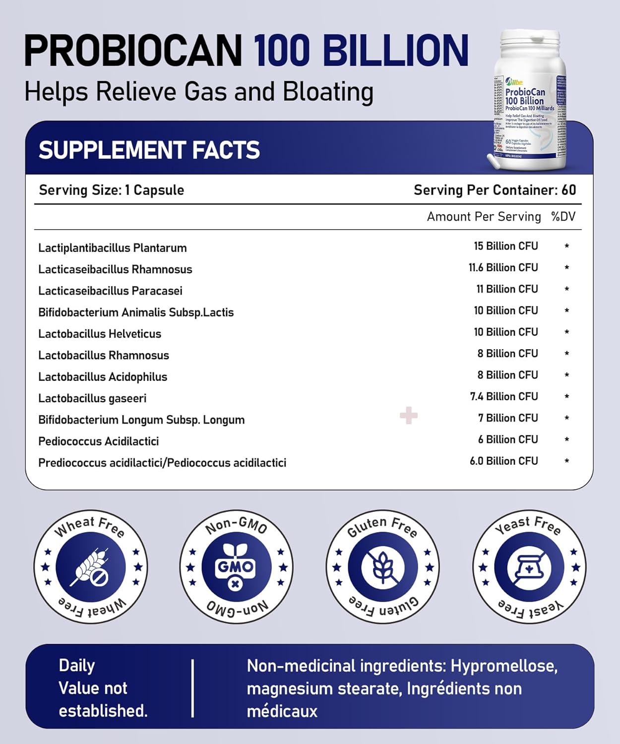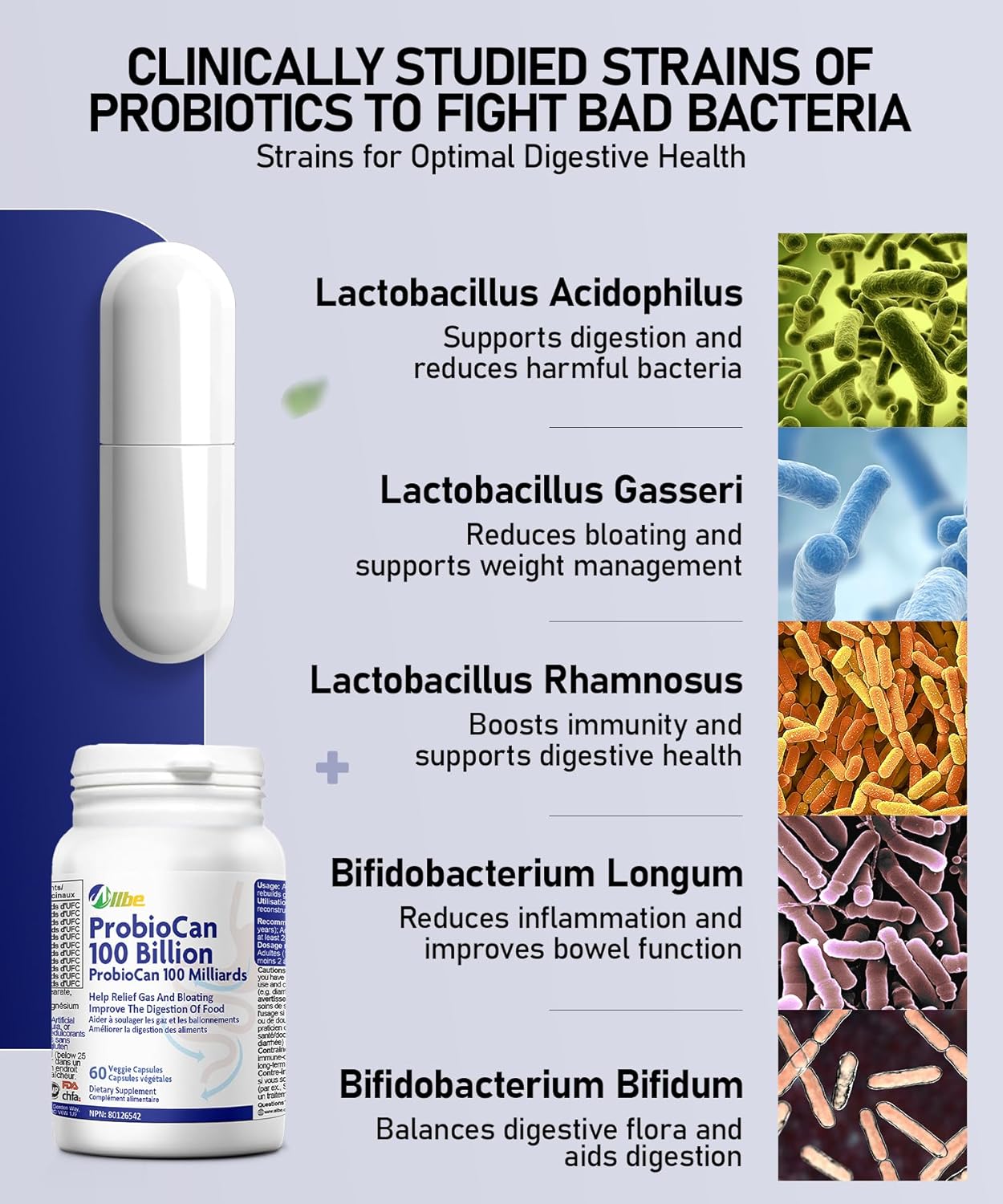 ALLBE ProbioCan 1000 亿 CFU - 含 11 种菌株的男性和女性每日益生菌 - 嗜酸乳杆菌和加氏乳杆菌 - 肠道健康和缓解腹胀 - 保质期长、纯素、非转基因 60 粒胶囊