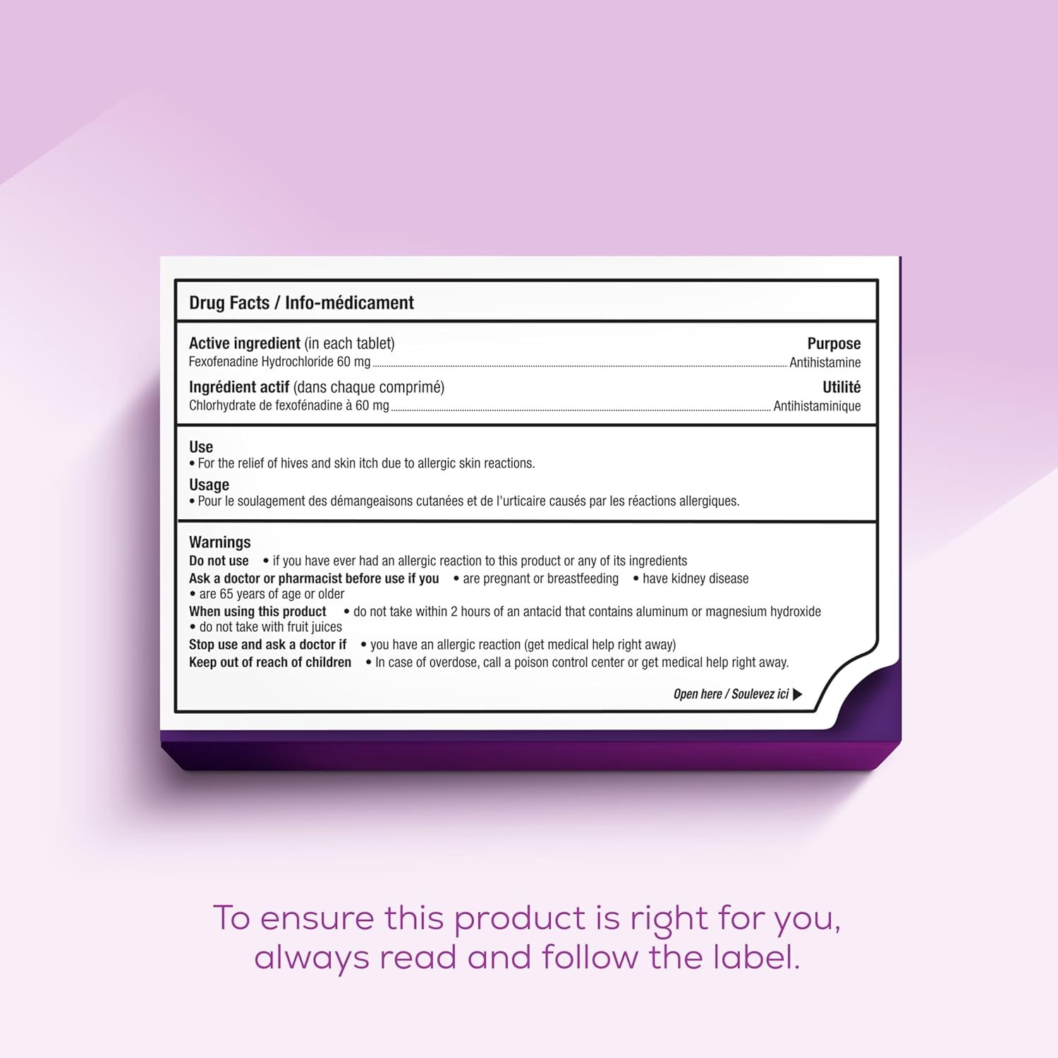 使用 Allegra Hives,告别荨麻疹和持续瘙痒。不同于那些只能缓解皮肤表面瘙痒的非处方外用药物,Allegra Hives 药物从内部起效,有效缓解过敏性皮肤反应引起的瘙痒。其活性成分为盐酸非索非那定,这是一种不引起嗜睡的抗组胺药,不会让您感到疲倦和迟钝。一片 Allegra Hives 过敏药即可缓解荨麻疹和皮肤瘙痒长达 12 小时,让您轻松享受一整天的活动,而不会因荨麻疹而感到疲劳或不适。Allegra Hives 不含麸质和乳糖。Allegra Hives 过敏药适用于成人和 12 岁及以上儿童。这款36片装的盐酸非索非那定抗组胺过敏片,可随时随地缓解荨麻疹,持续12小时,不引起嗜睡。为确保本产品适合您,请务必阅读并遵循标签说明。
