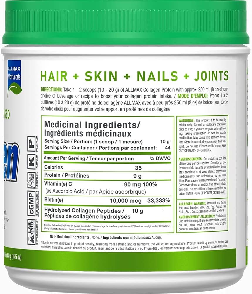 ALLMAX 胶原蛋白(含生物素 + 维生素 C)- 无味 - 草饲和牧场饲养 - 440 克 - 44 份