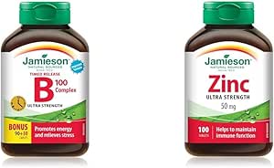 B100 复合维生素超强效缓释片 - 加大装,非转基因,无麸质。Jamieson B 复合维生素 100 毫克缓释片提供人体必需的 B 族维生素,有助于提升能量,同时缓解压力。Jamieson Laboratories 锌 50 毫克,100 片(1 包)Jamieson 锌 50 毫克吸收率高,有助于促进碳水化合物、脂肪和蛋白质的代谢,同时支持免疫系统健康。高效能有效预防锌缺乏症。