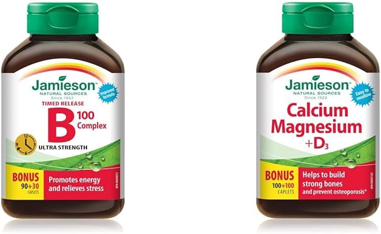 B100 复合超强效缓释片 - 加大装,非转基因,无麸质,黄色,120 粒(1 包)- 包装可能有所不同。Jamieson B 复合维生素 100 毫克缓释片提供人体必需的 B 族维生素,有助于提升能量,同时缓解压力。Jamieson 钙镁维生素 D3 片:Jamieson 钙镁维生素 D3 片提供最佳的 2:1 钙镁比例,有助于改善钙的吸收。维生素 D3 也支持钙的高效吸收,使该配方易于吸收,从而促进骨骼和肌肉健康。每天服用三次钙镁维生素 D3 片,有助于改善整体骨骼健康,同时降低骨质疏松症的风险。