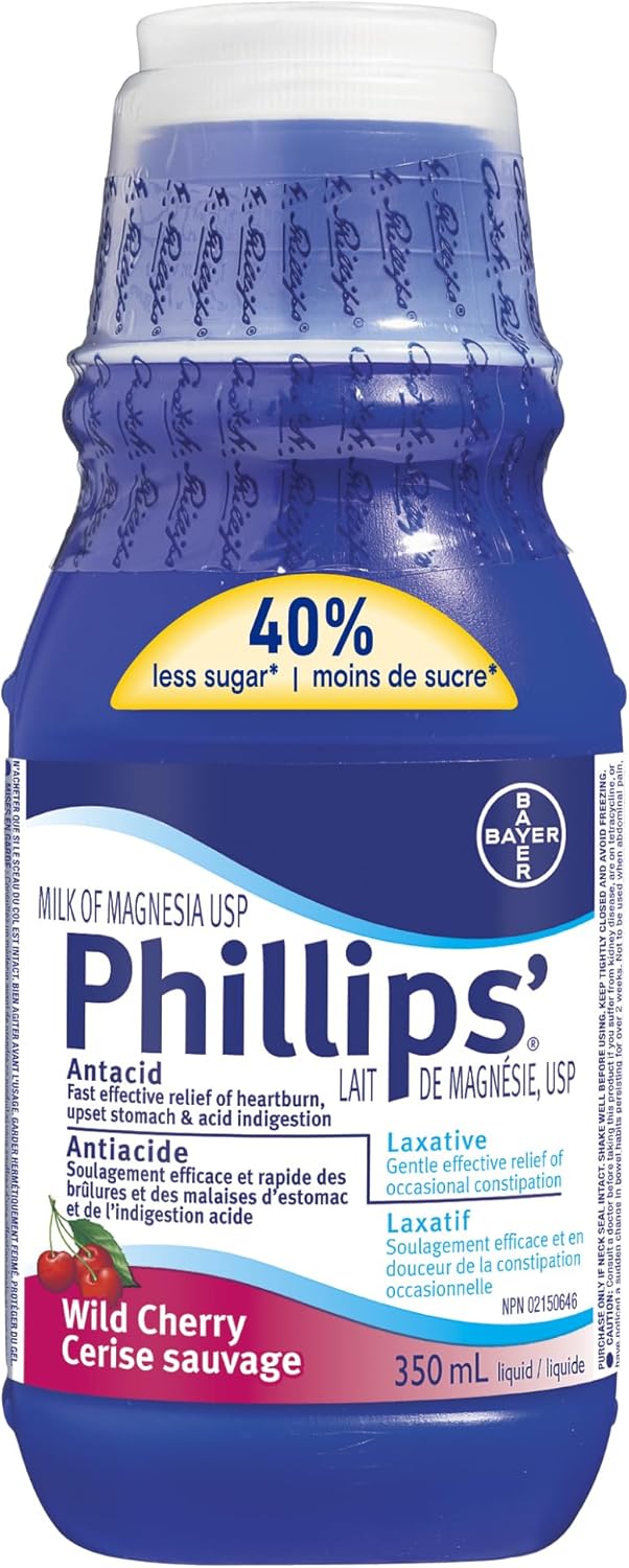 拜耳菲利普镁乳液体是一种抗酸剂,可缓解胃部不适、烧心和酸性消化不良。它也是一种泻药,能有效温和地缓解便秘。它带有浓郁的樱桃香味。温和有效地缓解偶发性便秘。350毫升装。