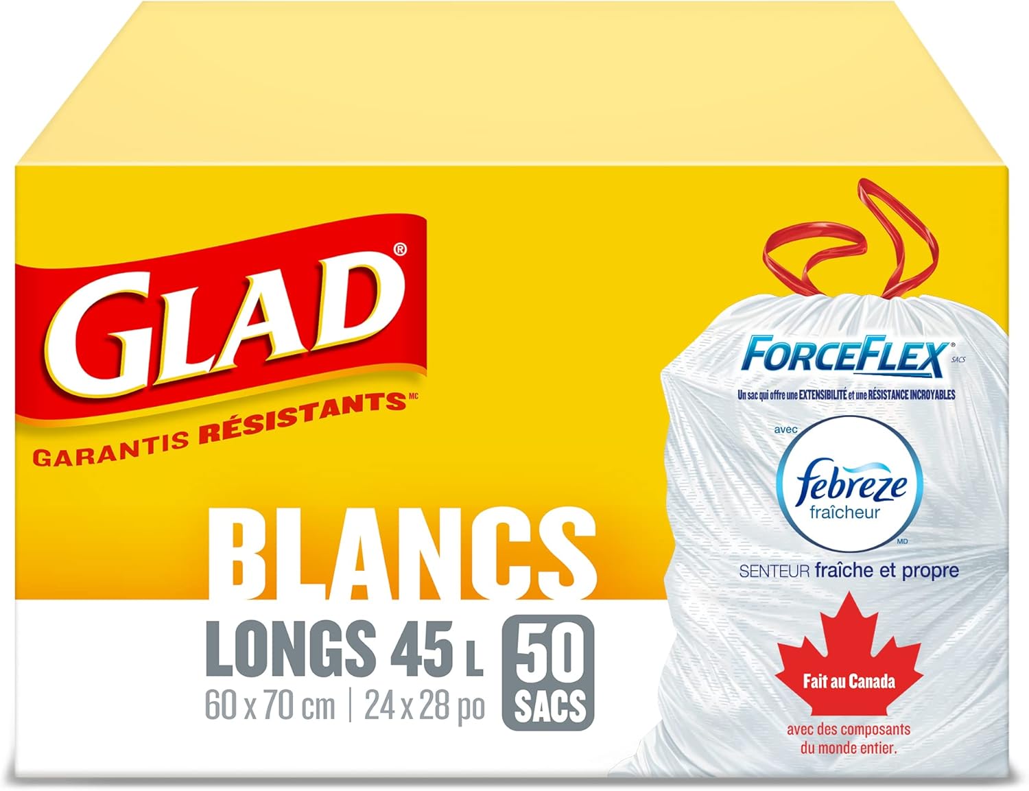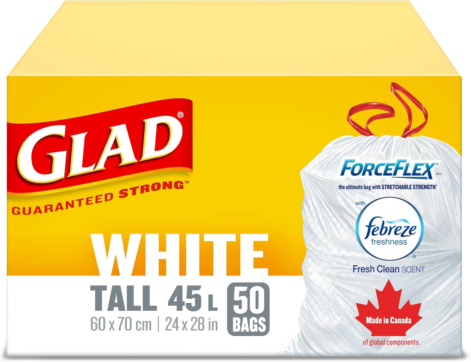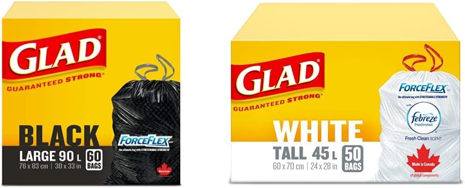 Glad 黑色垃圾袋 - 大号 90 升 - ForceFlex,抽绳,60 个垃圾袋,加拿大制造,Global Components 出品,GLAD 垃圾袋可满足您的需求。它们结实耐用,可帮助您避免最脏乱的垃圾灾难。独特的 Forceflex 钻石纹理可随垃圾一起拉伸,防止撕裂。由于采用抽绳封口,即使是很重的袋子也可以轻松地带到路边。GLAD。保证坚固。Glad 白色垃圾袋 - 高号 45 升 - ForceFlex,抽绳,带有 Febreze 清新清洁香味,50 个垃圾袋,加拿大制造,Global Components 出品,GLAD 垃圾袋可满足您的需求。它们结实耐用,可帮助您避免最脏乱的垃圾灾难。独特的 Forceflex 钻石纹理可随垃圾一起拉伸,防止撕裂。由于采用抽绳封口,即使是很重的袋子也可以轻松地带到路边。GLAD。保证强劲。