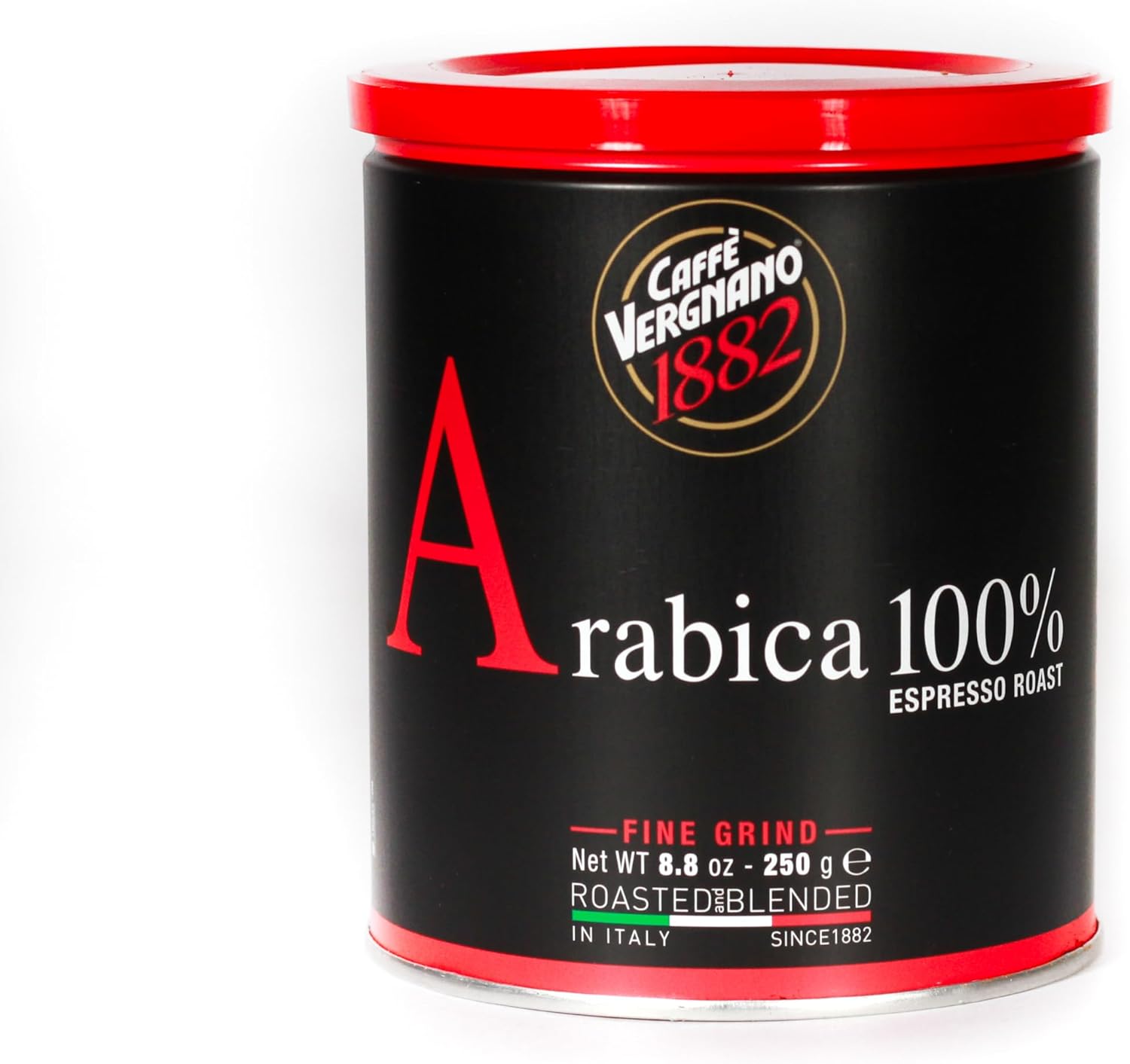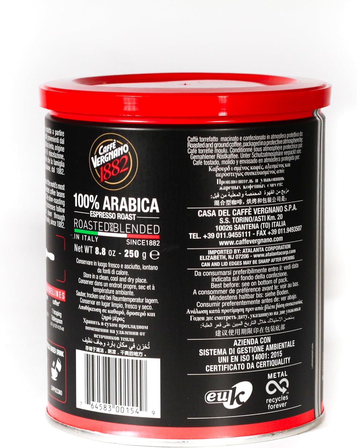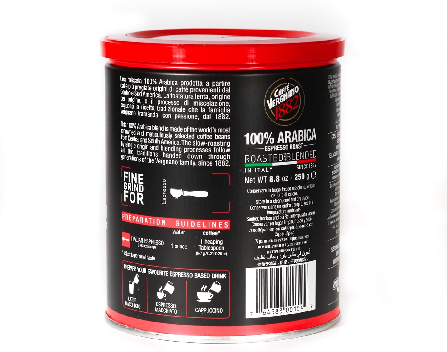 Caffè Vergnano 阿拉比卡咖啡浓缩咖啡罐,250 克。此罐咖啡粉采用 Vergnano 阿拉比卡混合咖啡豆,研磨精细,适合浓缩咖啡机使用。此罐咖啡粉采用 Vergnano 阿拉比卡混合咖啡豆,研磨精细,适合浓缩咖啡机使用。