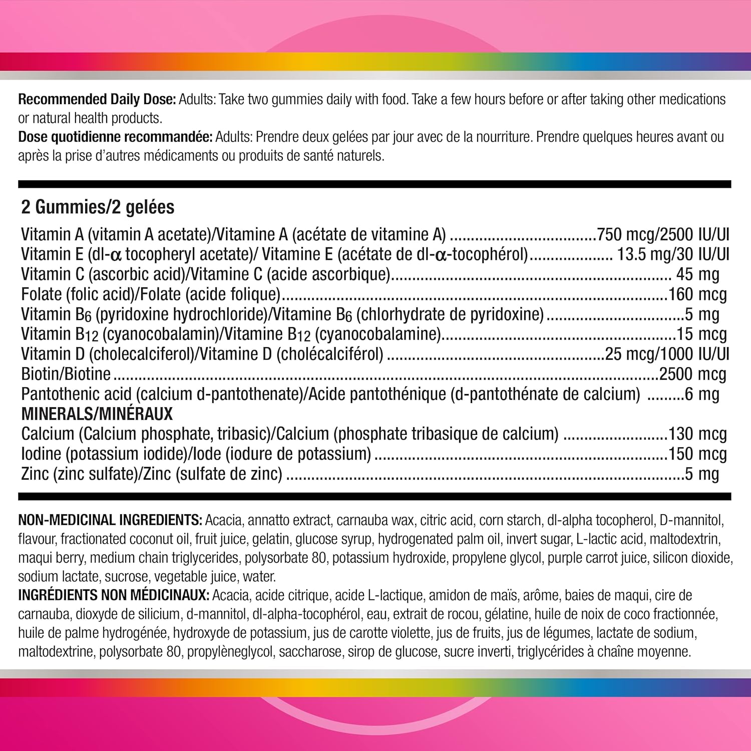 Centrum 女士多种维生素/矿物质软糖,樱桃、浆果和橙子口味,130 粒软糖(包装可能有所不同)Centrum 女士多种维生素软糖专为女性配制,每剂含钙和 1,000 IU 维生素 D,可满足女性的营养需求。Centrum 女士多种维生素软糖是一种美味的方式,有助于支持免疫系统;保持健康的皮肤;维持身体代谢营养的能力;每天只需两粒软糖即可提供抗氧化剂。无麸质的 Centrum 女士多种维生素软糖配方由内而外滋养您的身体,支持身体健康。凭借超过 35 年的营养科学专业知识,Centrum 是医生推荐的排名第一的多种维生素品牌*和加拿大销量第一的多种维生素品牌。**此包装包括一瓶 130 粒装的 Centrum 女士多种维生素软糖补充剂,有樱桃、浆果和橙子口味。 (*基于 2020 年 3 月的 IMS Health 数据;**Centrum 的计算部分基于尼尔森通过其市场跟踪服务报告的截至 2020 年 10 月 31 日的 52 周期间成人维生素类别的数据)Centrum MultiGummies,Multi+Beauty 复合维生素软糖,男女适用的头发、皮肤和指甲维生素,樱桃、浆果和橙子口味,90 粒软糖Centrum MultiGummies Multi+Beauty 复合维生素采用多种营养素混合而成,包括维生素 A、C、E 和生物素,有助于促进头发浓密、保持皮肤健康和强化指甲。Centrum MultiGummies Multi+Beauty 是一种美味的方式,有助于支持免疫系统、维持视力并帮助能量代谢,每天只需两粒软糖。无麸质的 Centrum MultiGummies Multi+Beauty 的维生素和矿物质配方可从内部滋养您的身体,以支持身体健康。 Centrum 凭借超过 35 年的营养科学专业知识,是加拿大排名第一的医生推荐复合维生素品牌*,也是销量第一的复合维生素品牌**。本套装包含一瓶 90 粒装的 Centrum 复合维生素软糖,多种口味可选,包括樱桃、浆果和橙子。(*基于 2020 年 3 月的 IMS Health 数据;**Centrum 的计算部分基于尼尔森通过其市场跟踪服务报告的截至 2020 年 10 月 31 日的 52 周成人维生素类别数据)