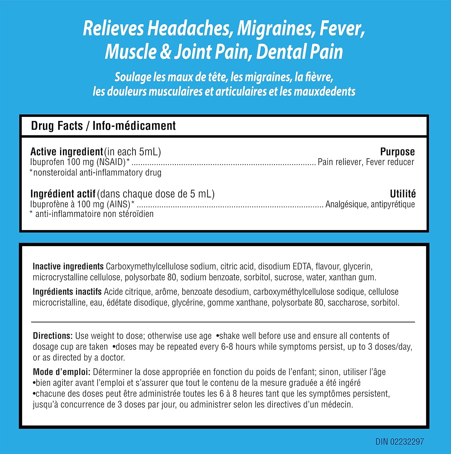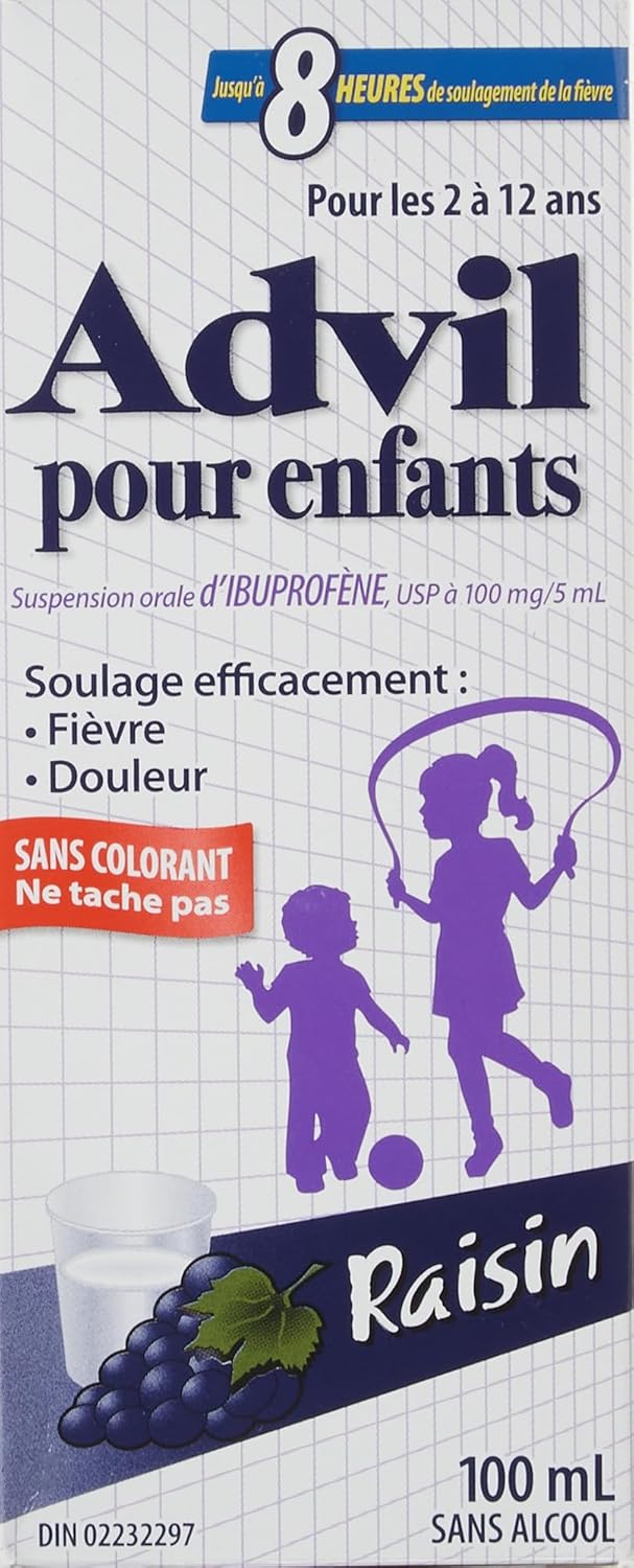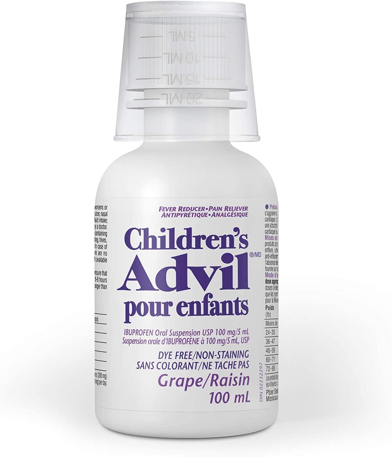 儿童 Advil(100 毫升,葡萄味)布洛芬悬浮液,无染料,暂时退烧