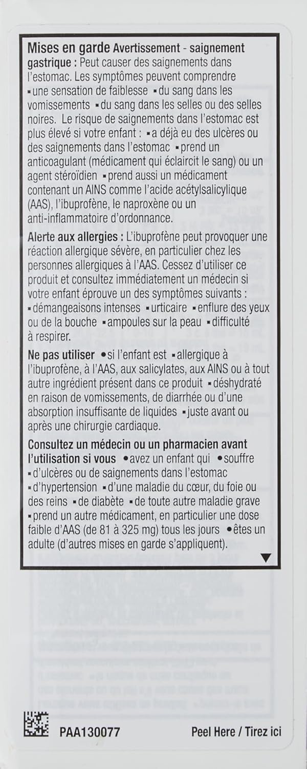专为 2 至 12 岁儿童配制的无酒精儿童 Advil 口服混悬液可退烧并缓解免疫接种、耳痛、感冒或流感以及喉咙痛引起的疼痛。这种无染色、无染料的液体配方具有孩子们会喜欢的美味葡萄口味,易于服用,帮助您的孩子找回童真。每 5 毫升(1 茶匙)儿童 Advil 口服混悬液含有 100 毫克布洛芬。经临床验证,它可以长达 8 小时缓解发烧,还可以有效缓解肌肉酸痛、牙痛和头痛。此包装包含一瓶 100 毫升的儿童 Advil 无染料口服混悬液,具有美味的葡萄口味。Advil 中的止痛药是布洛芬,它是一种非甾体抗炎药 (NSAID),按照说明服用是一种安全有效的止痛和退烧药。