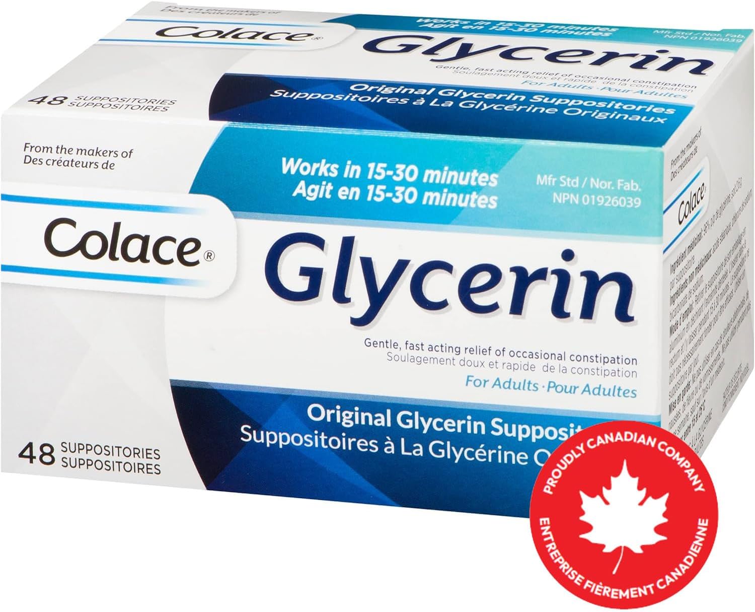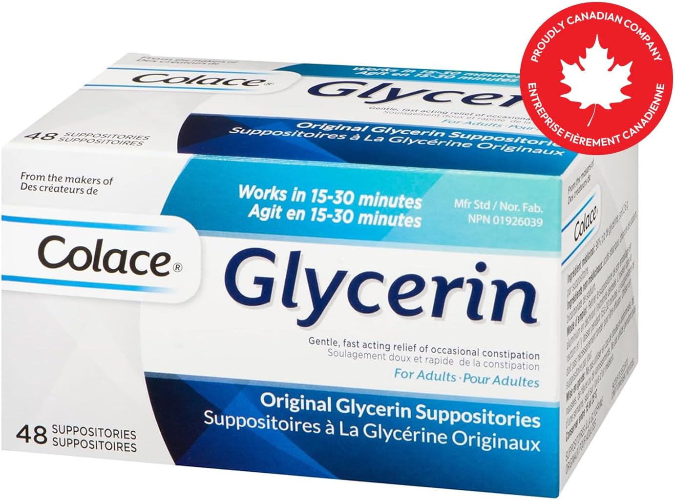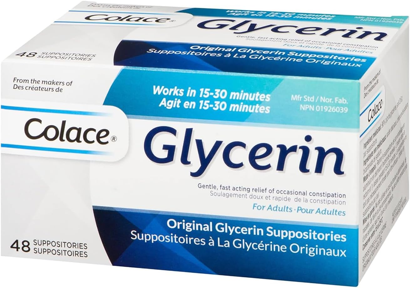 Colace 甘油栓 - 成人 | 温和快速缓解偶发性便秘 | 48 粒