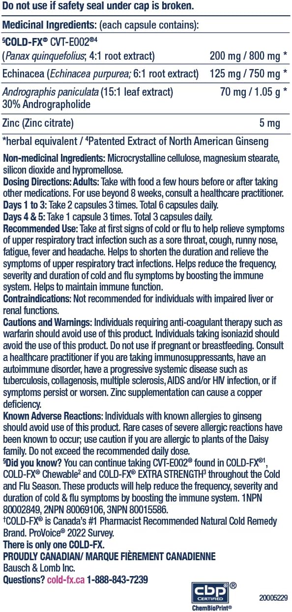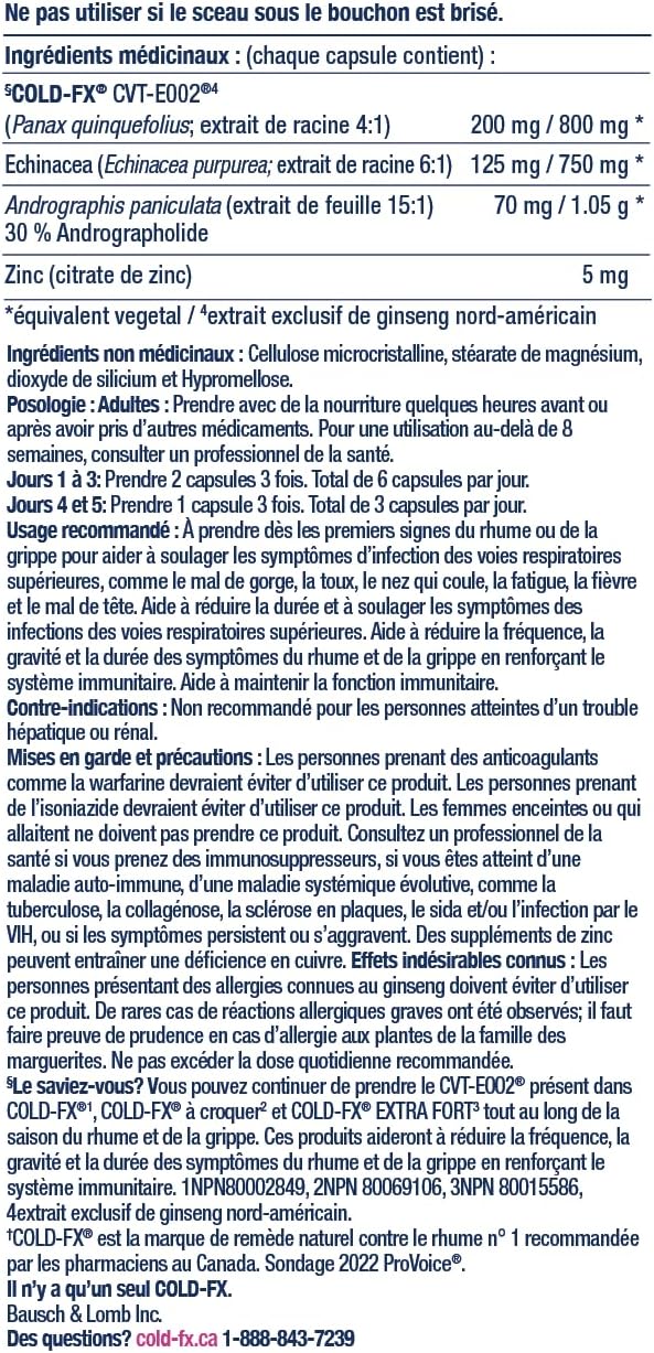 COLD-FX 初现症状缓解胶囊,蕴含北美人参提取物、紫锥菊、穿心莲和锌,有效增强免疫系统。感冒和流感症状出现?是时候尝试 COLD-FX 初现症状缓解胶囊了。在出现感冒或流感症状初期服用这款天然保健品,有助于缓解上呼吸道感染症状,例如咽喉痛、咳嗽、流鼻涕、疲劳、发烧和头痛。采用优质成分配制而成的COLD-FX FIRST SIGNS不瞌睡配方,包含:5毫克锌,有助于维持免疫功能;70毫克天然穿心莲,有助于缓解上呼吸道感染症状;125毫克紫锥菊,有助于缓解症状并缩短上呼吸道感染持续时间;以及200毫克活性成分CVT-E002。CVT-E002独特提取自西洋参(北美人参,4:1,800毫克**)的根部,有助于增强免疫系统,减少感冒和流感症状的发生频率、严重程度和持续时间。立即探索加拿大药剂师推荐的排名第一的天然感冒药品牌*。