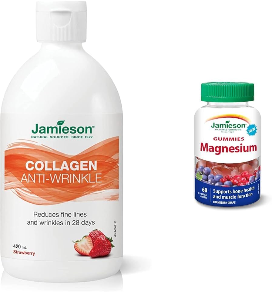 胶原蛋白抗皱液,草莓味,420 毫升(1 包)Jamieson 胶原蛋白抗皱液是一款美味易服用的液体。非常适合不喜欢吞咽药丸的人,有助于减少细纹和皱纹,增强皮肤弹性。Jamieson 镁软糖 - 蔓越莓葡萄味,60 粒(1 包)Jamieson 镁软糖是一种方便美味的镁补充剂。镁是一种重要的矿物质,有助于强健骨骼和健康肌肉功能的发育。每粒蔓越莓葡萄味软糖含有 20 毫克镁,可根据个人需求调整剂量。