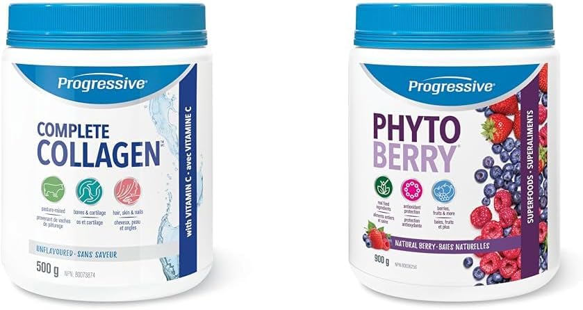完整胶原蛋白粉补充剂 - 无味,500 克 | 非转基因、无抗生素、无激素。Progressive 完整胶原蛋白有助于维持强健的骨骼、软骨和结缔组织。每勺含有 10 克胶原蛋白,并添加维生素 C 和色氨酸,确保胶原蛋白得到有效利用。服用胶原蛋白的其他益处包括促进头发、皮肤和指甲的健康。Progressive Phytoberry 补充粉 - 900 克 | 抗氧化剂来源,由 40 种浓缩果汁、植物营养素和植物油制成。Progressive PhytoBerry 是一款高浓度全身抗氧化补充剂,源自 40 多种浓缩果汁、植物营养素和植物油。这款抗氧化粉末旨在支持整体健康,每勺提供的营养相当于 6 至 8 份新鲜水果。