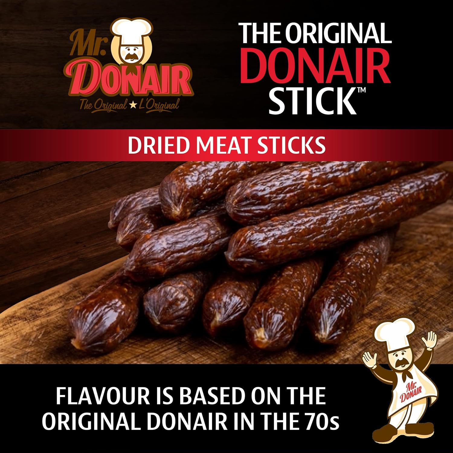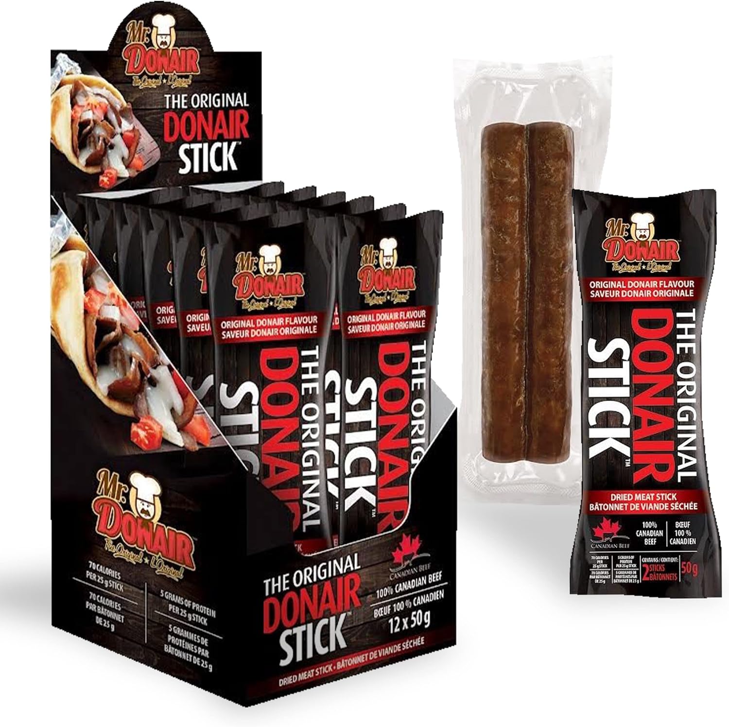 Donair 风味肉干棒 - 采用 100% 加拿大牛肉制成 - 富含蛋白质,非常适合零食 - 每根 70 卡路里(12 x 50 克包装 - 每盒 24 根)