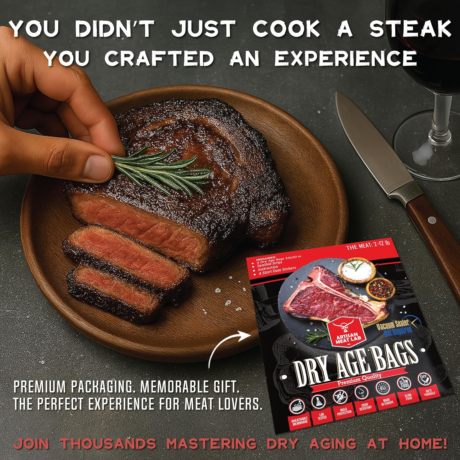 用这套工具制作美味的熟成牛排。它拥有专业熟成肉类所需的一切,让您获得令人垂涎的极致风味。内含4个干式熟成袋、4条密封条、4张开始日期贴纸和一本图文并茂的说明书。无需等待或购买其他耗材,即可立即开始干式熟成。尺寸为25x50厘米(10x20英寸),方便携带,可轻松容纳1-5公斤(2-12磅)的牛肉或其他肉类。只需将肉放入袋中,用真空封口机密封或使用浸泡法(阿基米德原理),贴上开始日期标签,即可熟成至完美状态。在试用这套工具之前,请勿食用任何牛排。令人惊叹的效果:只需3-4周即可完全熟成牛排。我们的薄膜干式熟成袋是业内最安全的。干式熟成袋与肉中的蛋白质形成天然结合,从而促进水分释放和氧气交换。这是获得美味熟成牛肉的最佳方式,同时还能确保卓越的安全性。别让您的牛排冒险!使用简单的粗棉布或干式熟成包装纸并不能保证肉的熟成质量。如果在干式熟成过程中不使用真空封口机,异味和细菌很容易影响并毁掉您完美的美味肉品。为了避免失望,请选择 Artisan Meat Lab 的干式熟成肉袋。它们消除了污染的风险,并以干式熟成肉市场价格的一小部分,确保了最理想的效果。对于任何热爱牛排、烧烤、烤肉或DIY烹饪和食物准备的人来说,这都是一份绝佳的礼物。非常适合生日礼物、节日礼物、周年纪念日或父亲节礼物。现在就购买吧,我们有大量这款备受欢迎的优质肉类熟成套装。随着社交媒体上的口碑传播,它正在迅速销售。品牌:Artisan Meat LAB。形式:袋装。制造商:Artisan Meat LAB。单位:4.00 件。商品重量:90克。ASIN:B097Y91PSG。顾客评价:4.1 4.1 星(满分 5 星),250 个评分,4.1 星(满分 5 星)。畅销商品排名:食品杂货和美食类排名第 13,754 位(查看食品杂货和美食类排名前 100 名),肉干类排名第 73 位。首次上架日期:2021 年 11 月 19 日。