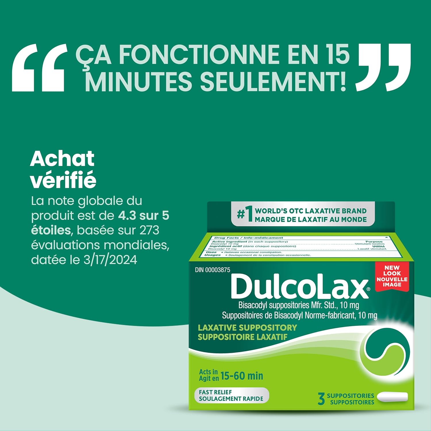 Dulcolax 比沙可啶泻药栓,10 毫克泻药,用于缓解偶发性便秘,15-60 分钟内起效,适用于成人和 12 岁以上儿童以及哺乳期妇女,缓解便秘,3 粒装