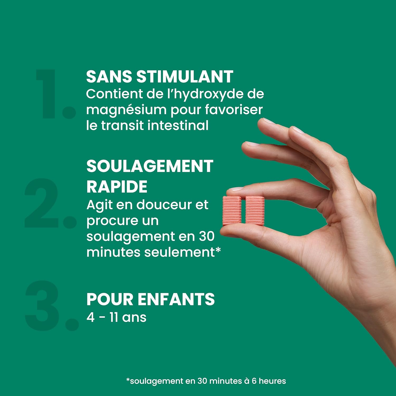 当您需要可预测的、偶尔缓解便秘时,DulcoLax 儿童软咀嚼片是您的最佳选择。这些缓解便秘的泻药为纯素食产品,不含麸质和兴奋剂。它们拥有美味的浆果口味,每个人都会喜欢。DulcoLax 儿童软咀嚼片可增加肠道水分滞留,刺激排便,软化粪便,使其更快排出。这些咀嚼片性质温和,只需 30 分钟即可缓解便秘(1)。DulcoLax 是全球排名第一的非处方泻药品牌(2),适用于 4 岁及以上儿童。查看其他 DulcoLax 产品,找到最适合您的产品。DulcoLax 拥有 60 多年的值得信赖历史,随时准备为您缓解偶尔的便秘。为确保本产品适合您,请务必阅读并遵循标签说明。(1) 起效时间为 30 分钟至 6 小时。 (2)基于 Nicholas Hall 的全球 CHC 数据库,DB6,MAT Q4 2024