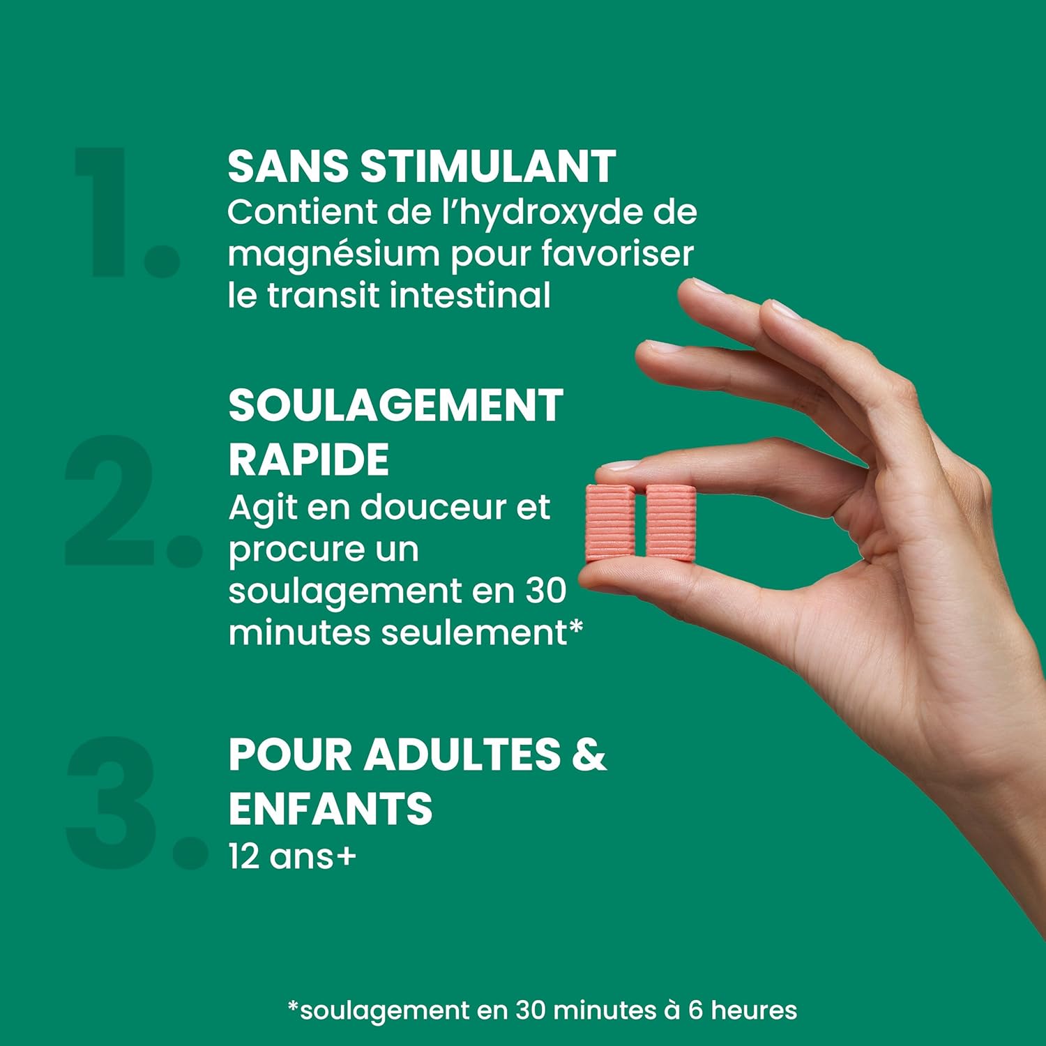 美味的混合浆果味 - 这款 30 粒装的美味浆果味速效泻药软咀嚼片非常适合偶尔缓解便秘。温和缓解偶尔便秘 - 每粒无刺激性和无麸质的温和软咀嚼泻药都含有活性成分氢氧化镁,可偶尔缓解便秘。快速缓解便秘 - DulcoLax 软咀嚼片可温和推动并软化大便,让您在短短 30 分钟内即可舒适排便 (1)。与您的身体协同作用 - 含有可缓解便秘的氢氧化镁,并与您体内的水分协同作用,促进排便顺畅,让您可以继续新的一天。适用于成人和儿童 - 本产品旨在为 12 岁及以上的成人和儿童缓解便秘